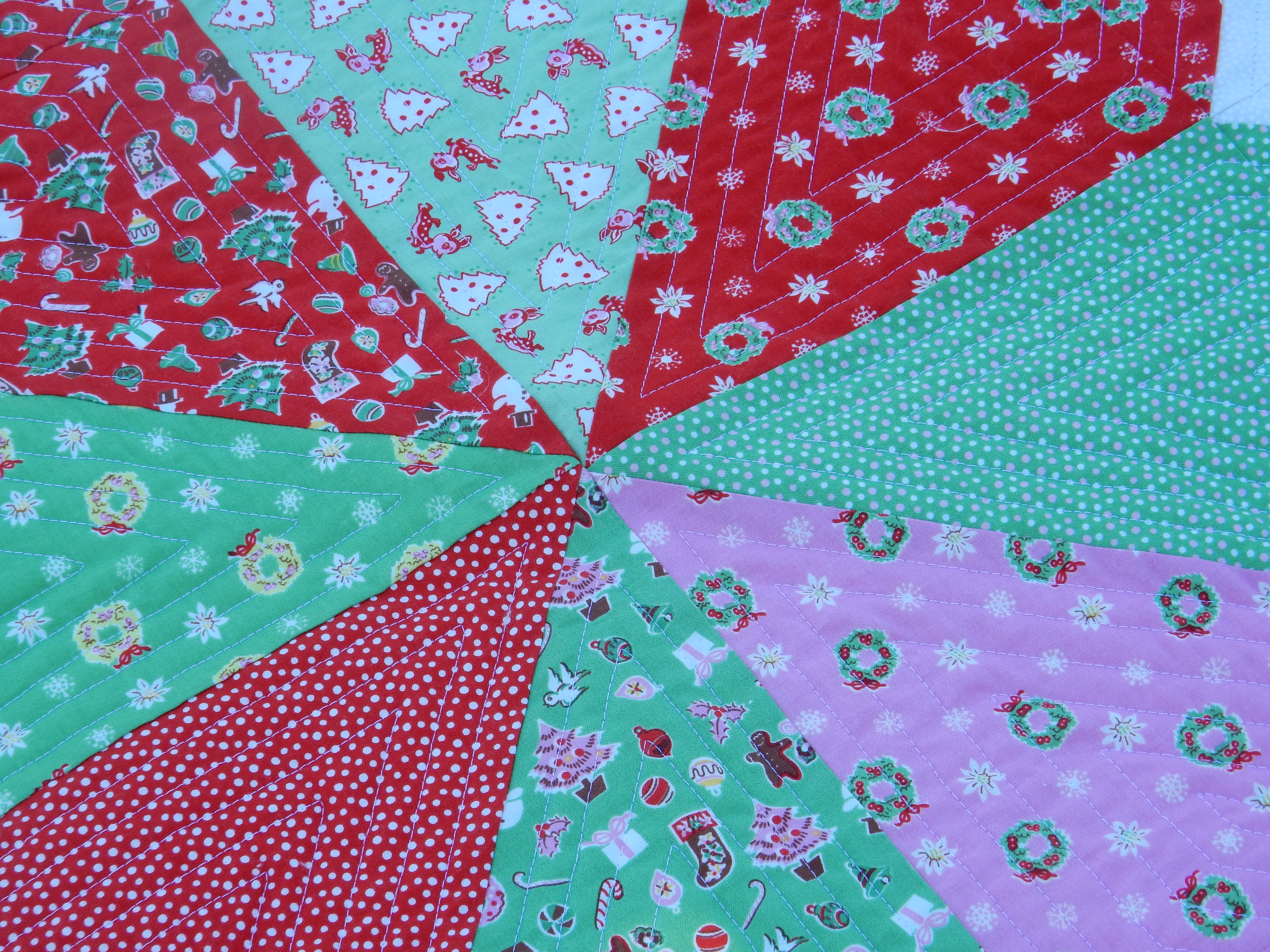 I included this picture because you can see the quilting pretty well.  I used my walking foot, chose a section, and worked in a “spiral” towards the center of each section.  No measuring or anything, I eyeballed it and drove full speed.  I have only quilted a few things myself.  I can’t see myself ever attempting anything the size of a bed.  I do like how this one worked out.  Practice makes perfect, right?