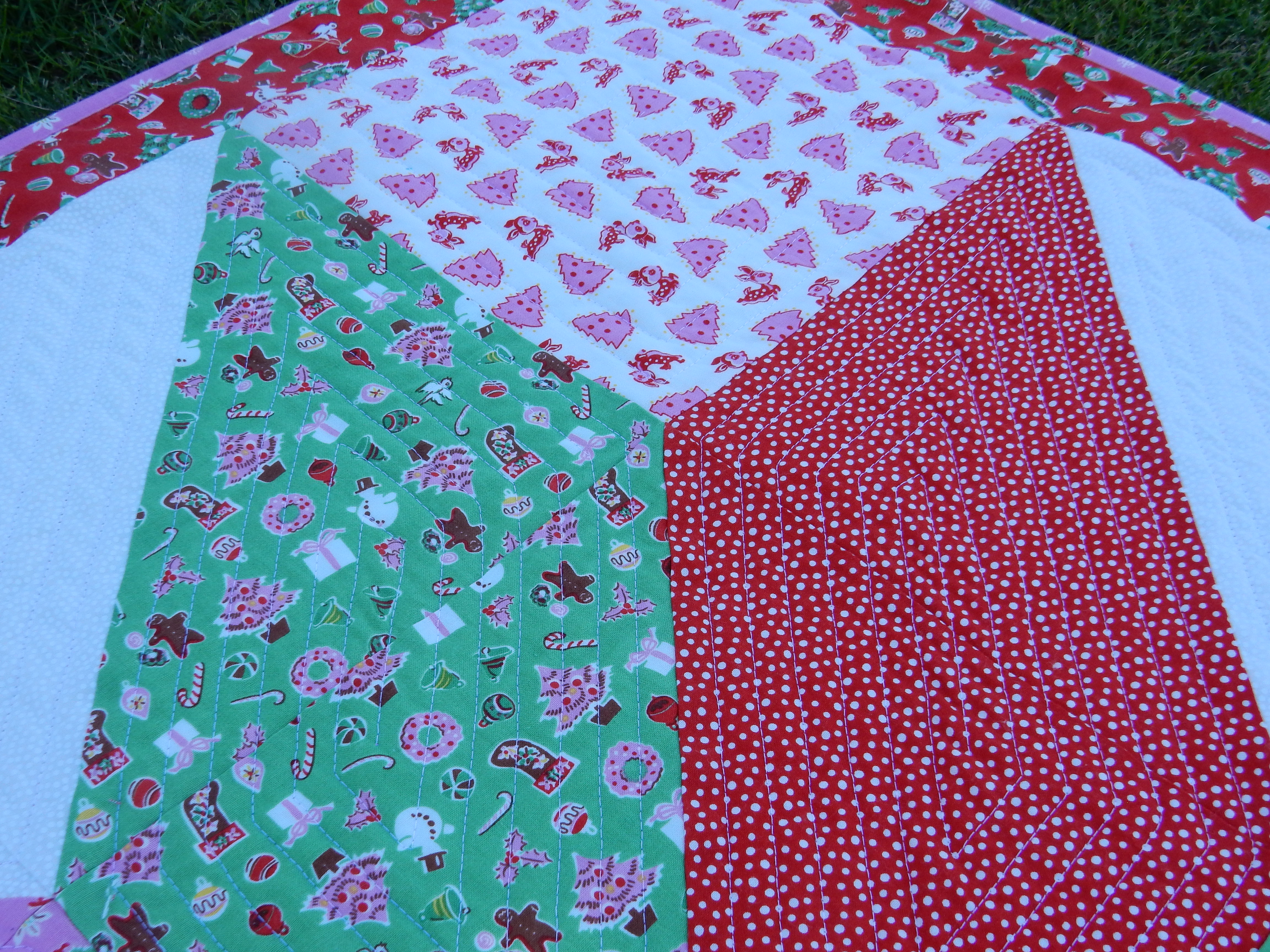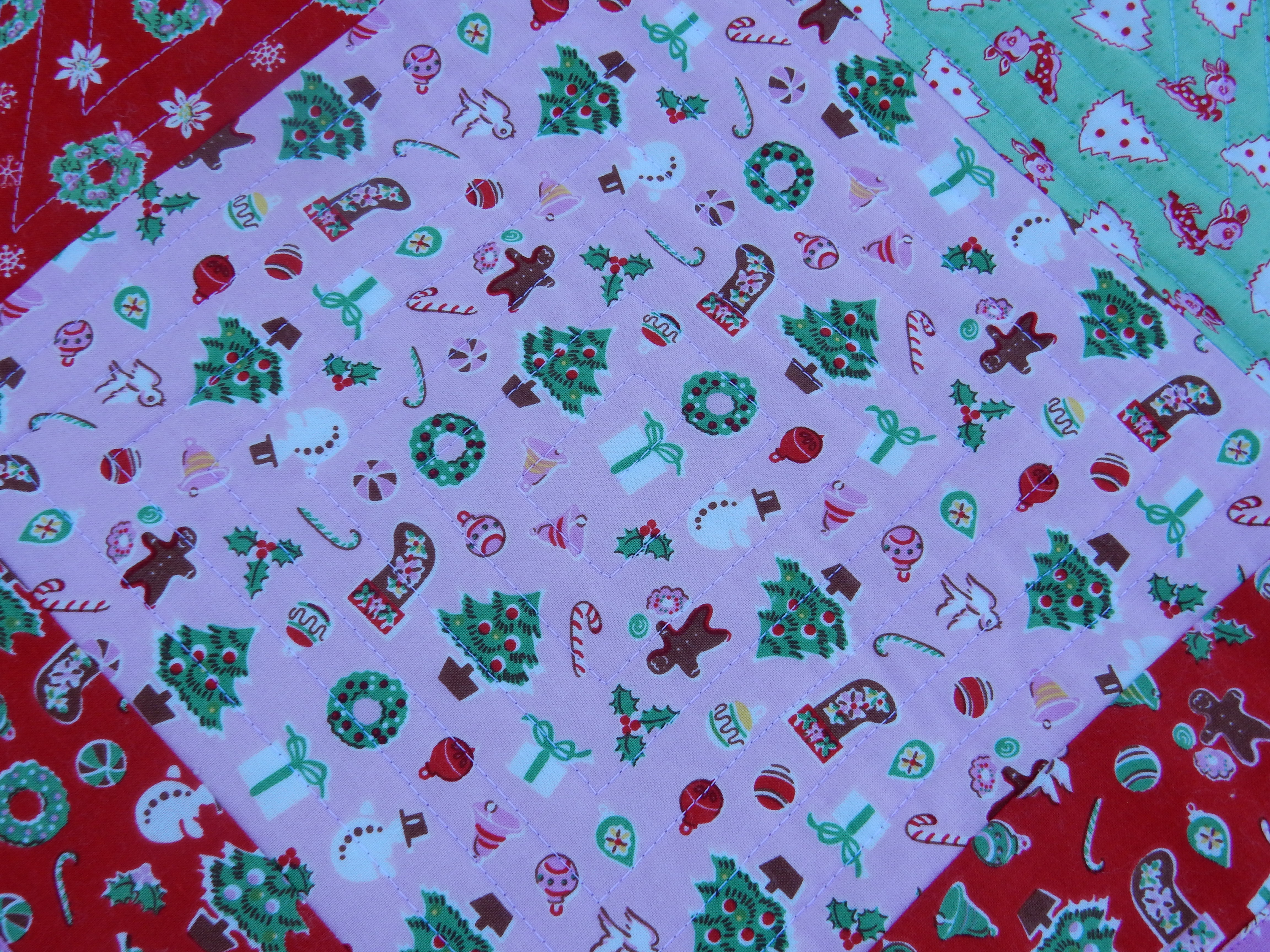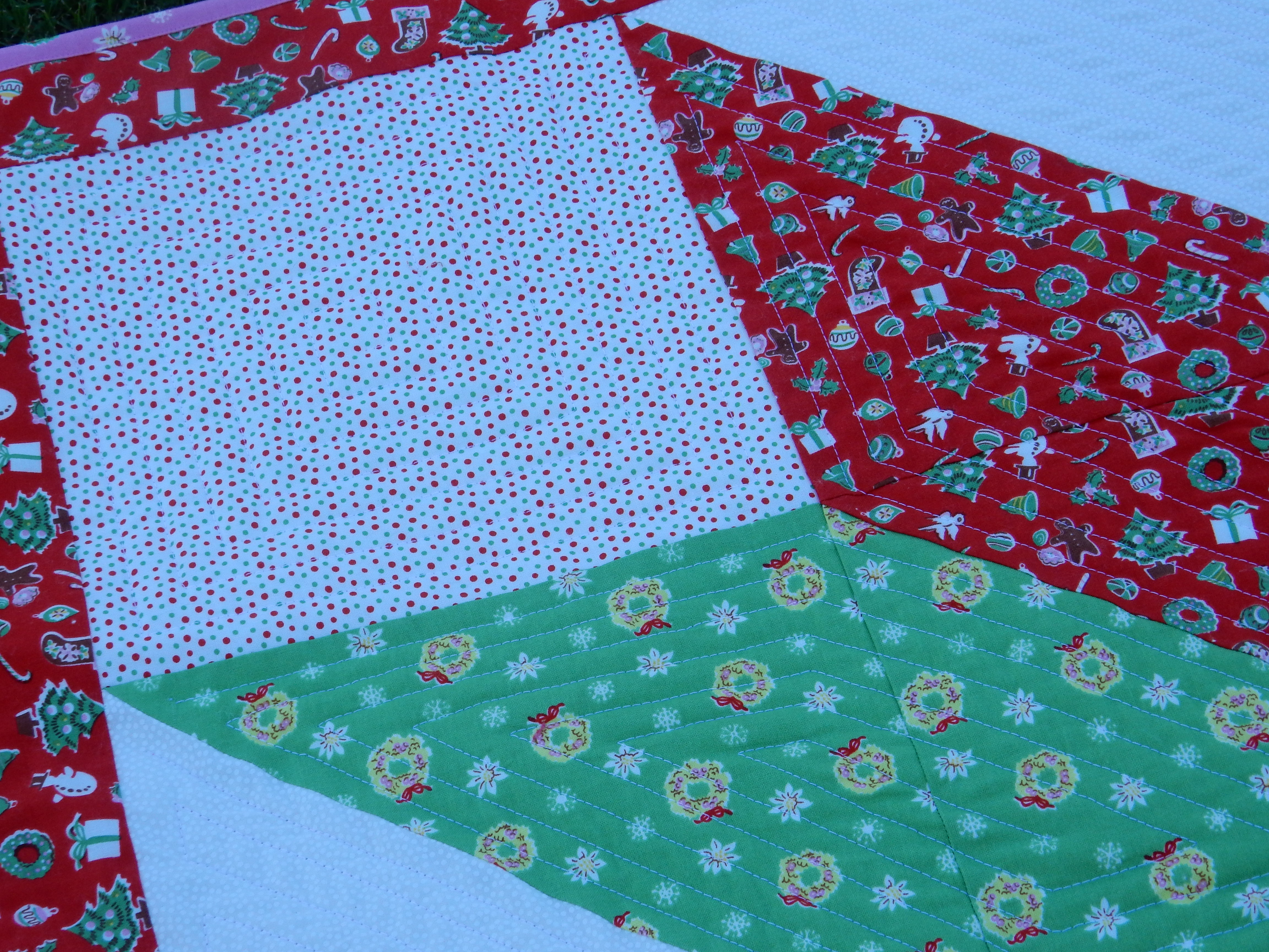 I love the look of a one block quilt.  This one uses 10″ squares, a portion of a layer cake.  I got it in my mind that I wanted to make this quilt for an upcoming baby.  And I decided it should be a Christmas quilt.  A Christmas baby girl quilt.