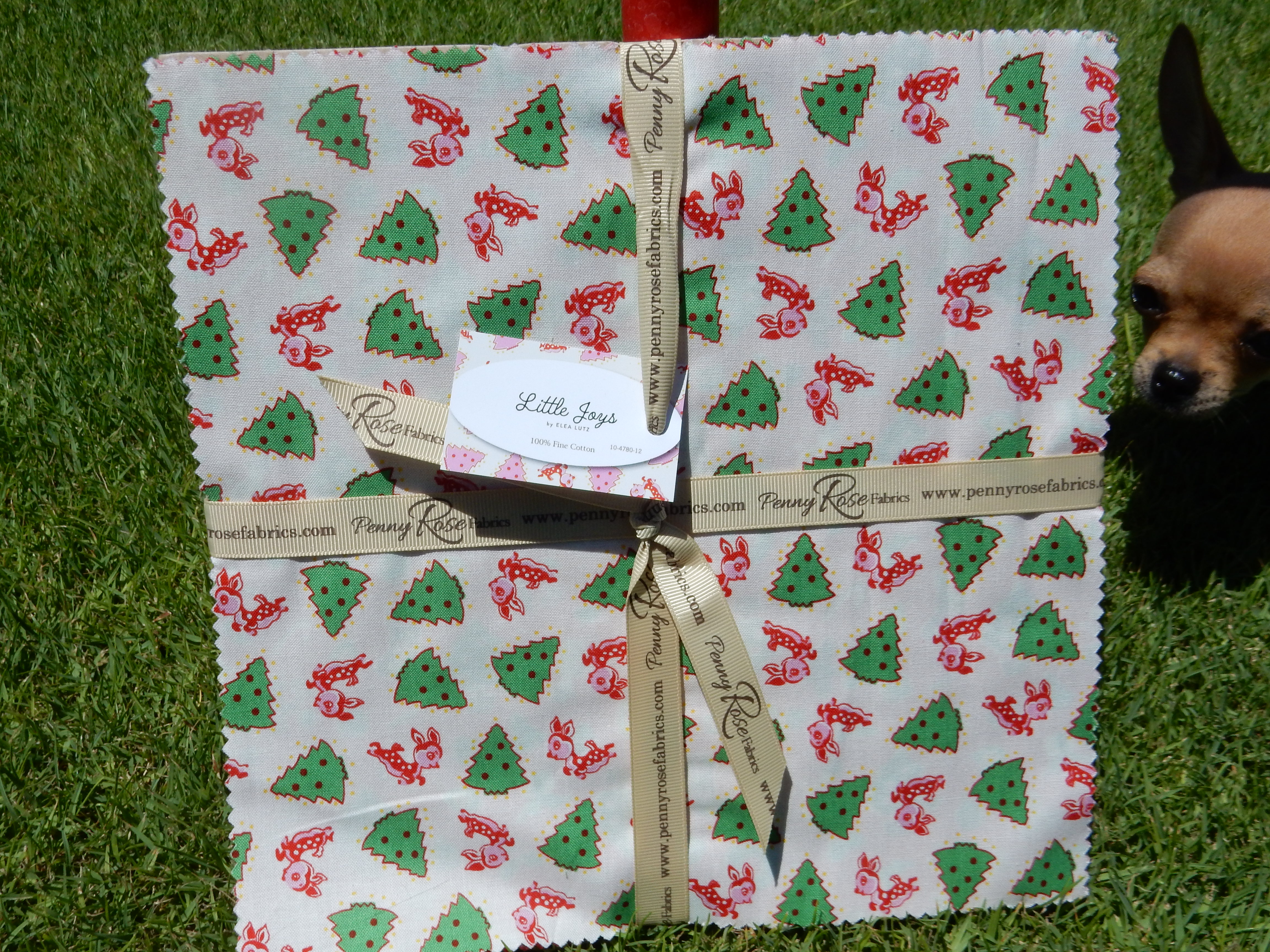 Dorito approves.  The fabric has such sweet prints.  Little reindeer, toys, trees, bows.  And there are PINKS in this Christmas collection!  My heart is aflutter.  I ordered some yardage for the border, backing and binding. Or course i got extra of the two pink prints!