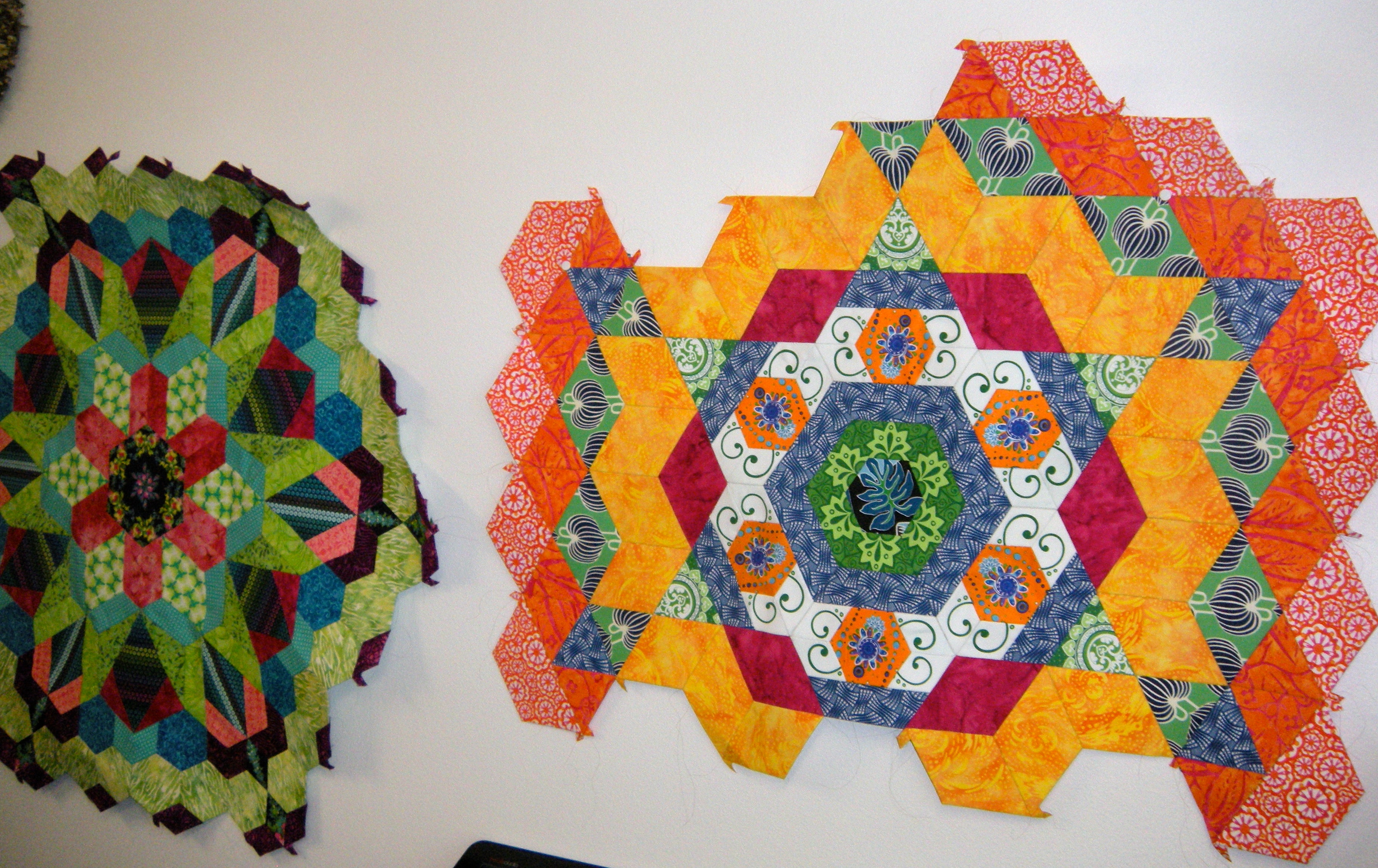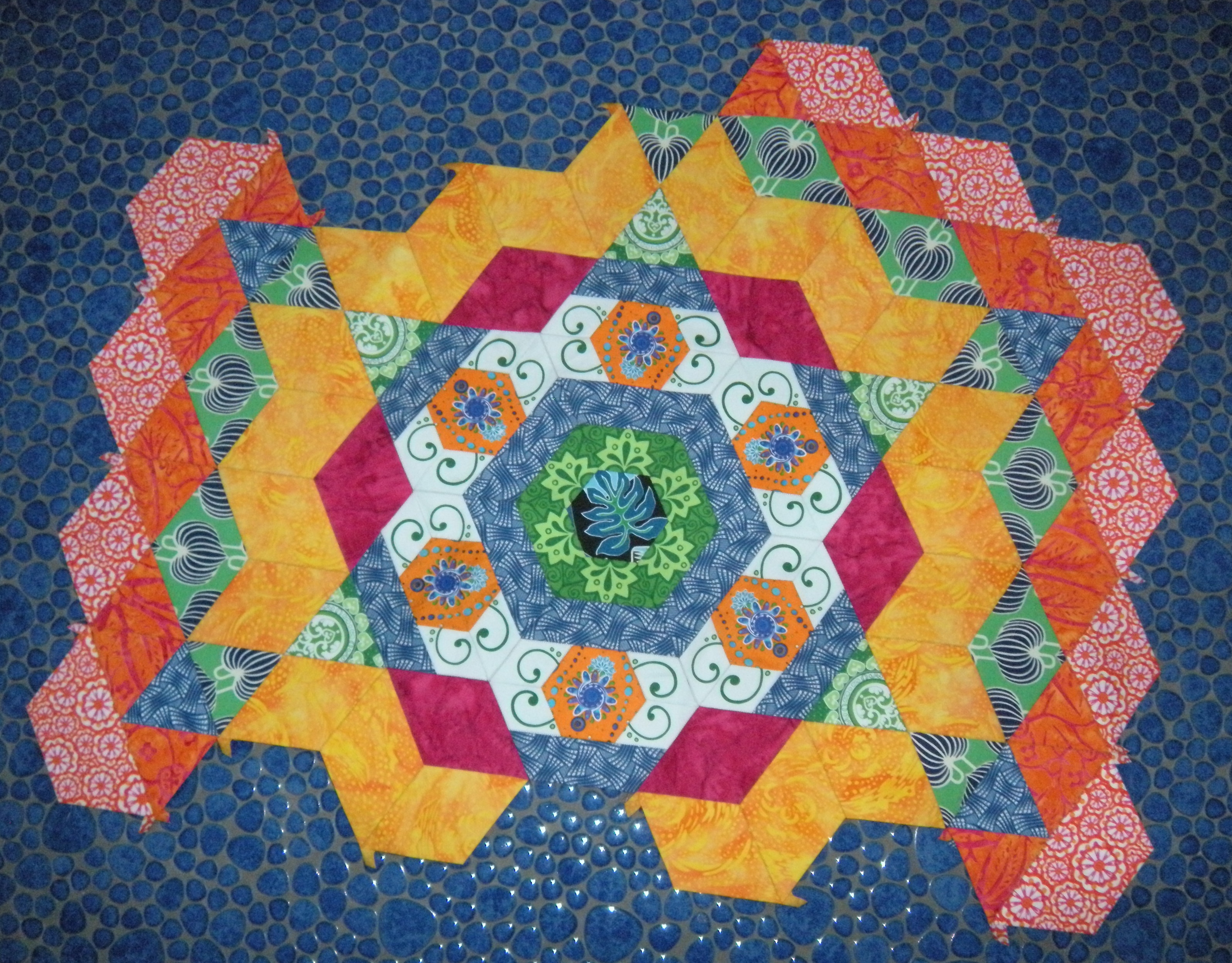Most of the time I think it is wonderful that I don’t know today’s date. That’s one of the perks of retirement. But on Friday, I had a lightbulb moment. I realized there was only one week left in February. And I had finished only the center of my “assignment” in the New Hexagon Millefiore Quilt along!