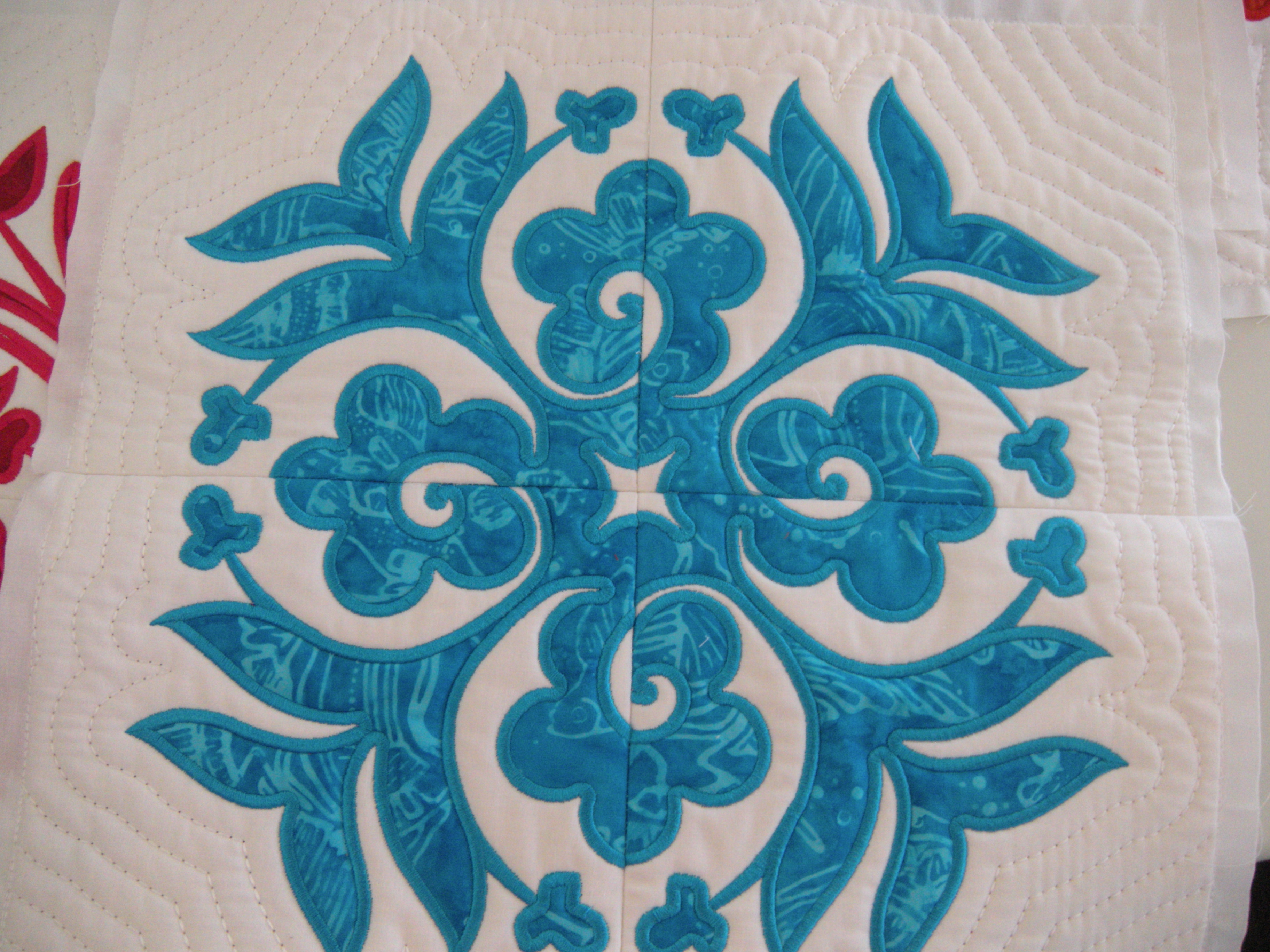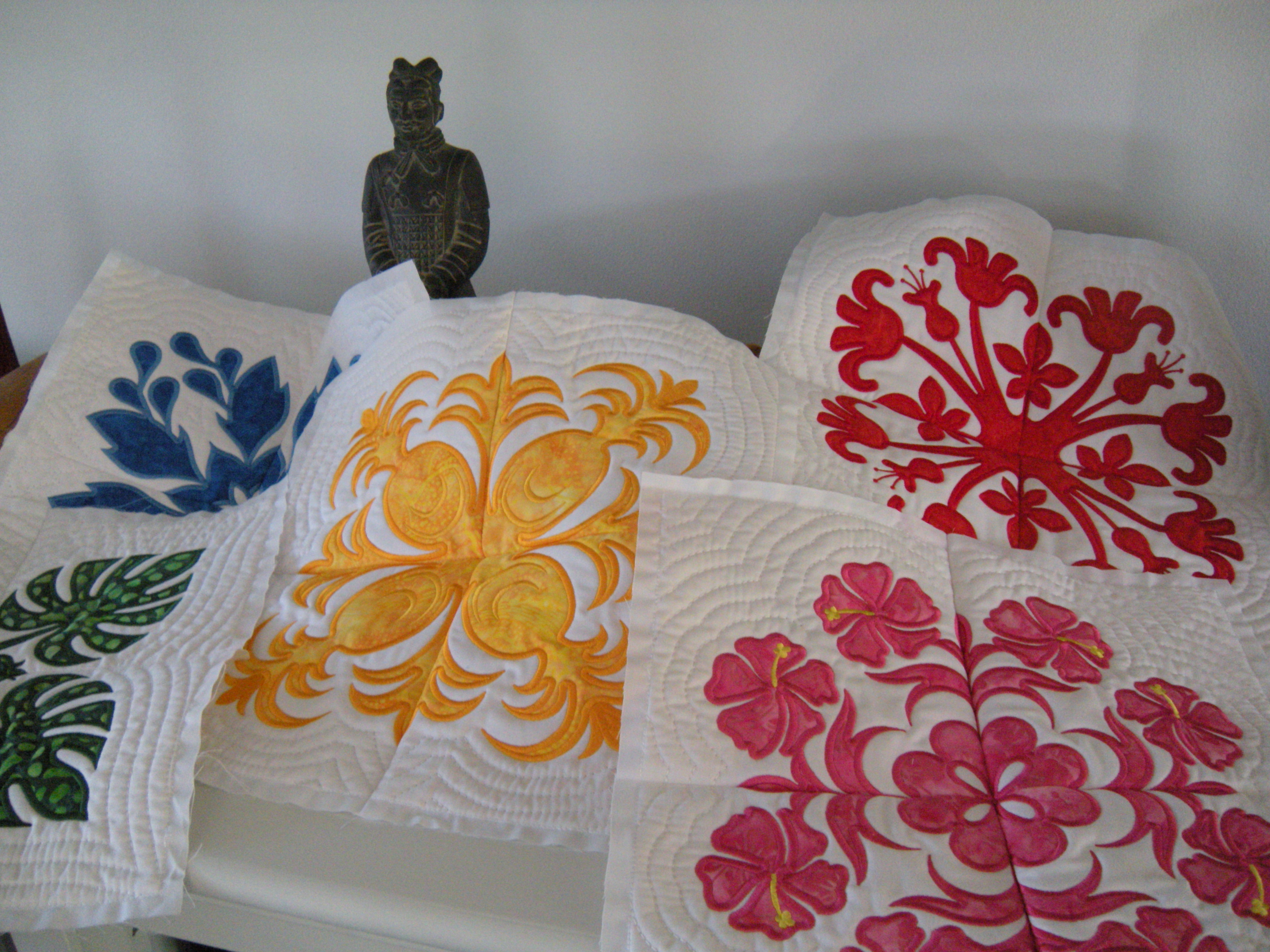 So if you are new to my party, each quilt block is made in a different batik fabric. The embroidery designs are by Anita Goodesign, from their Hawaiian Quilt collection. Each block is comprised of four identical machine embroidered sections. Each section took about three hours or so to make. I’m tired thinking about it.