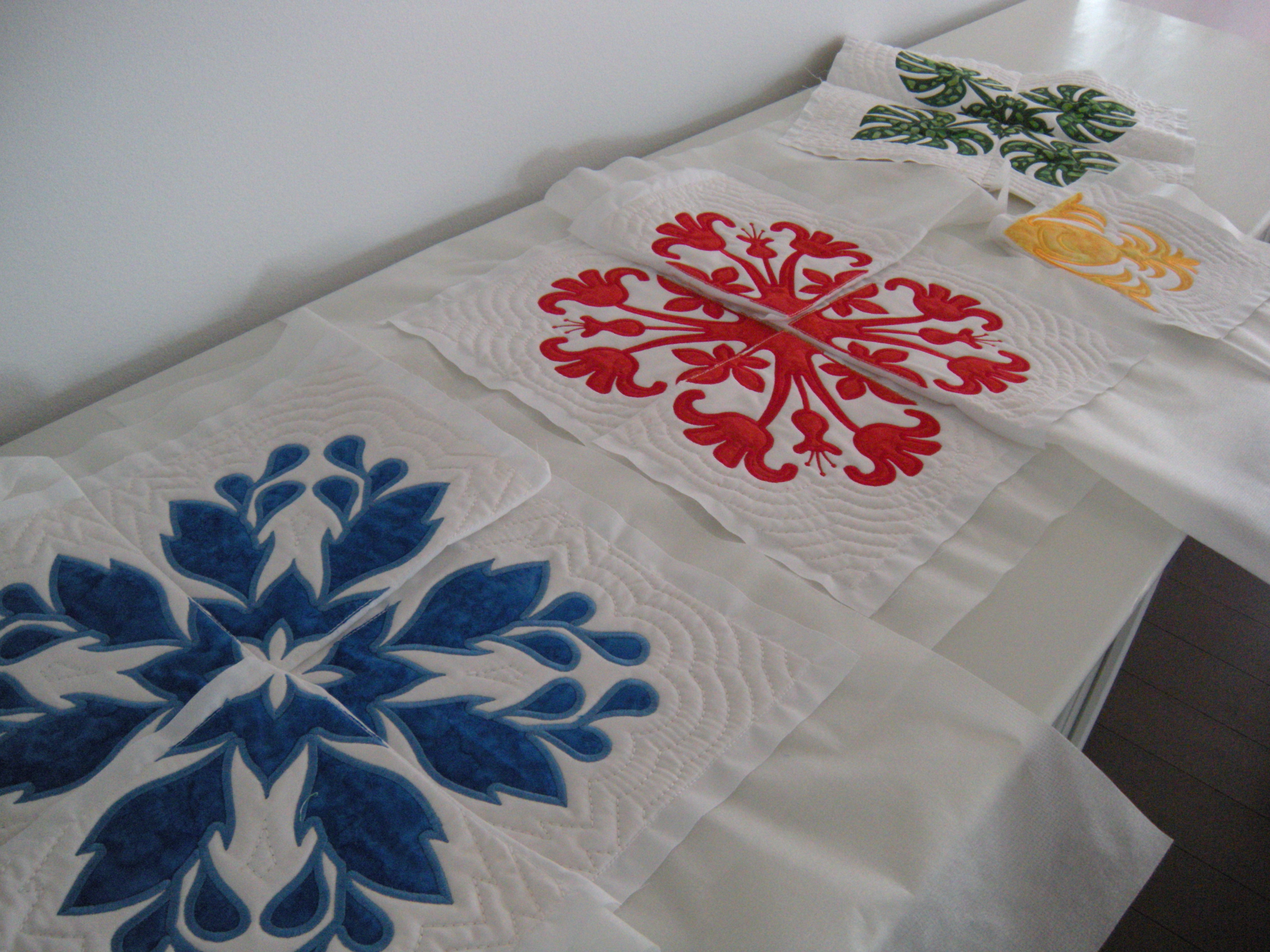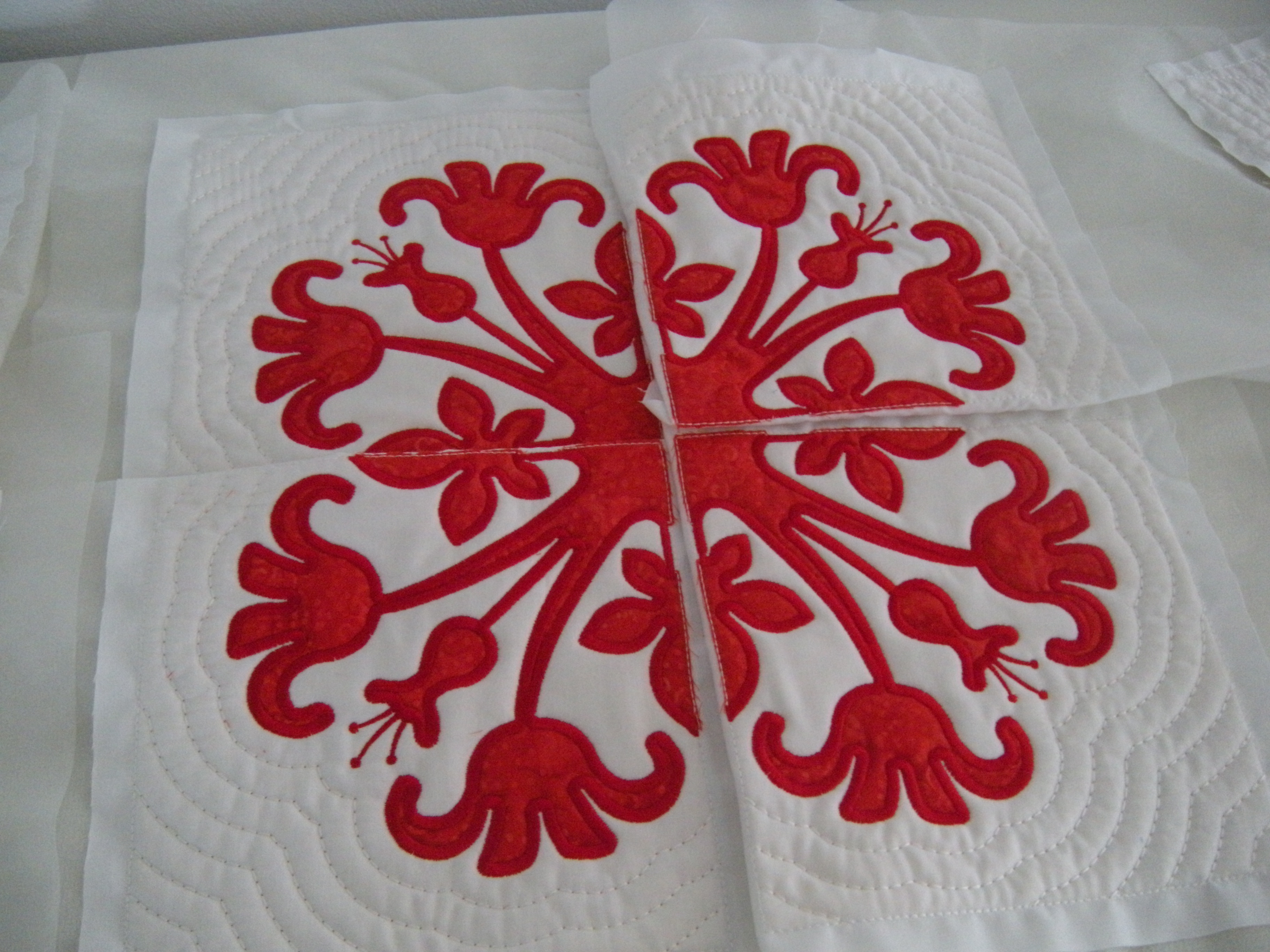 The lovely pink hibiscus! I also managed to stitch together the blocks for the red and blue designs, whatever the heck they are.