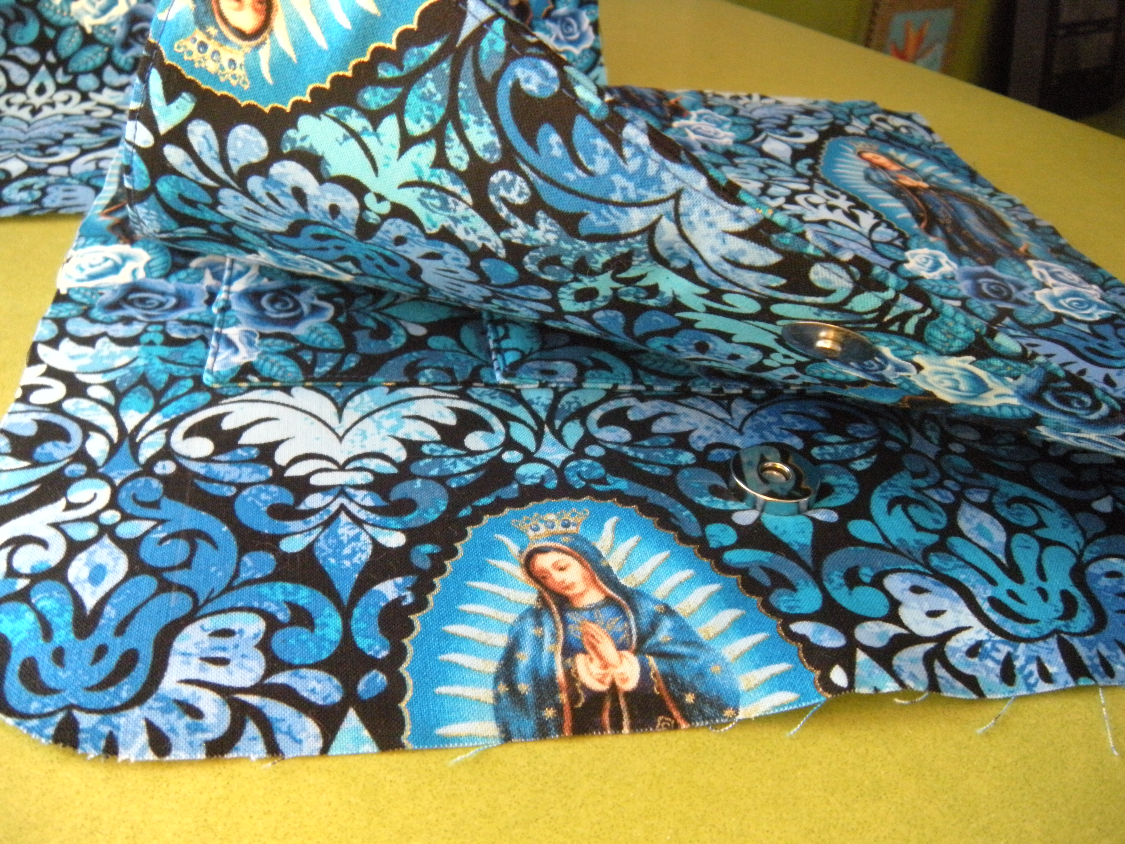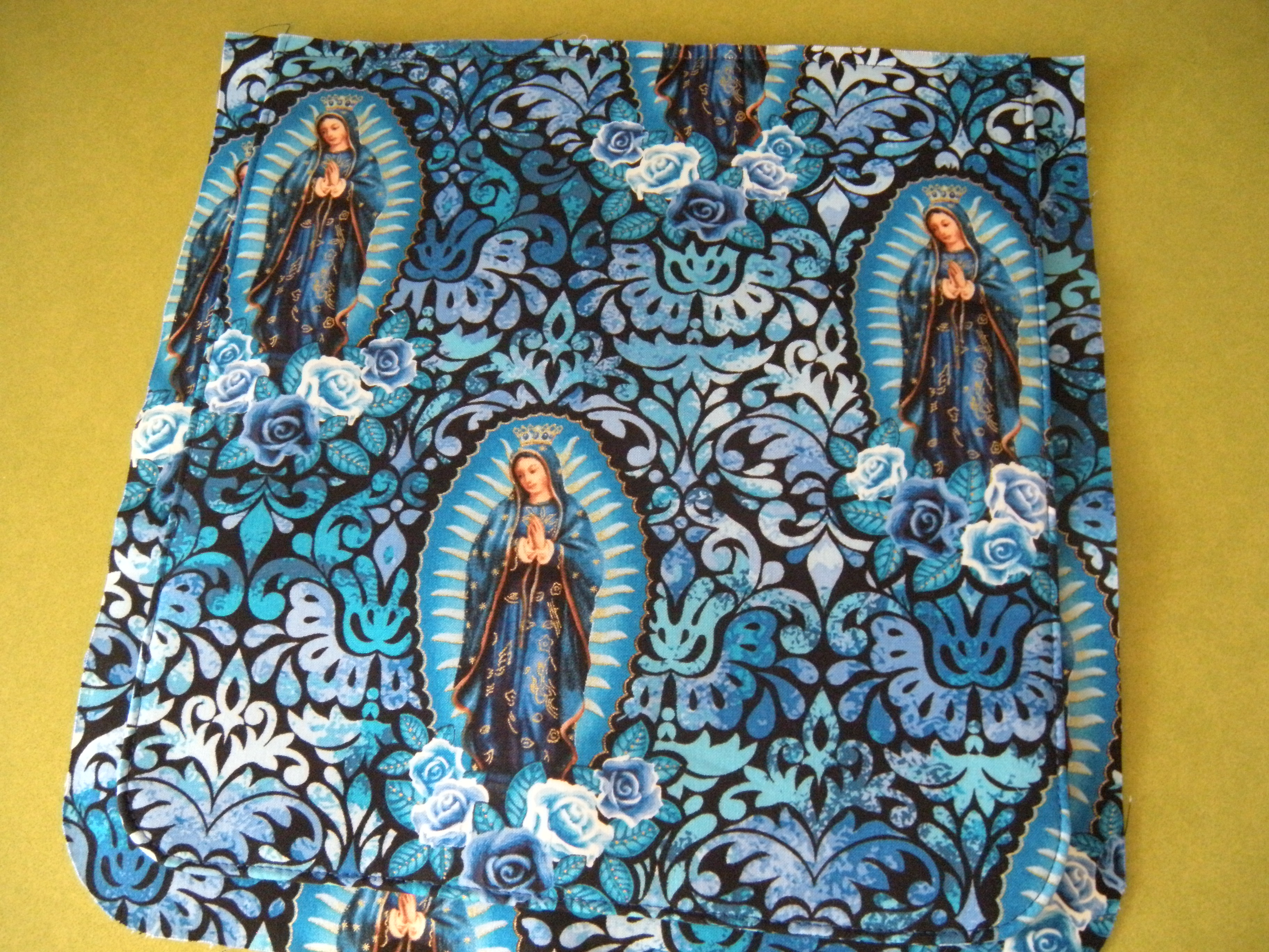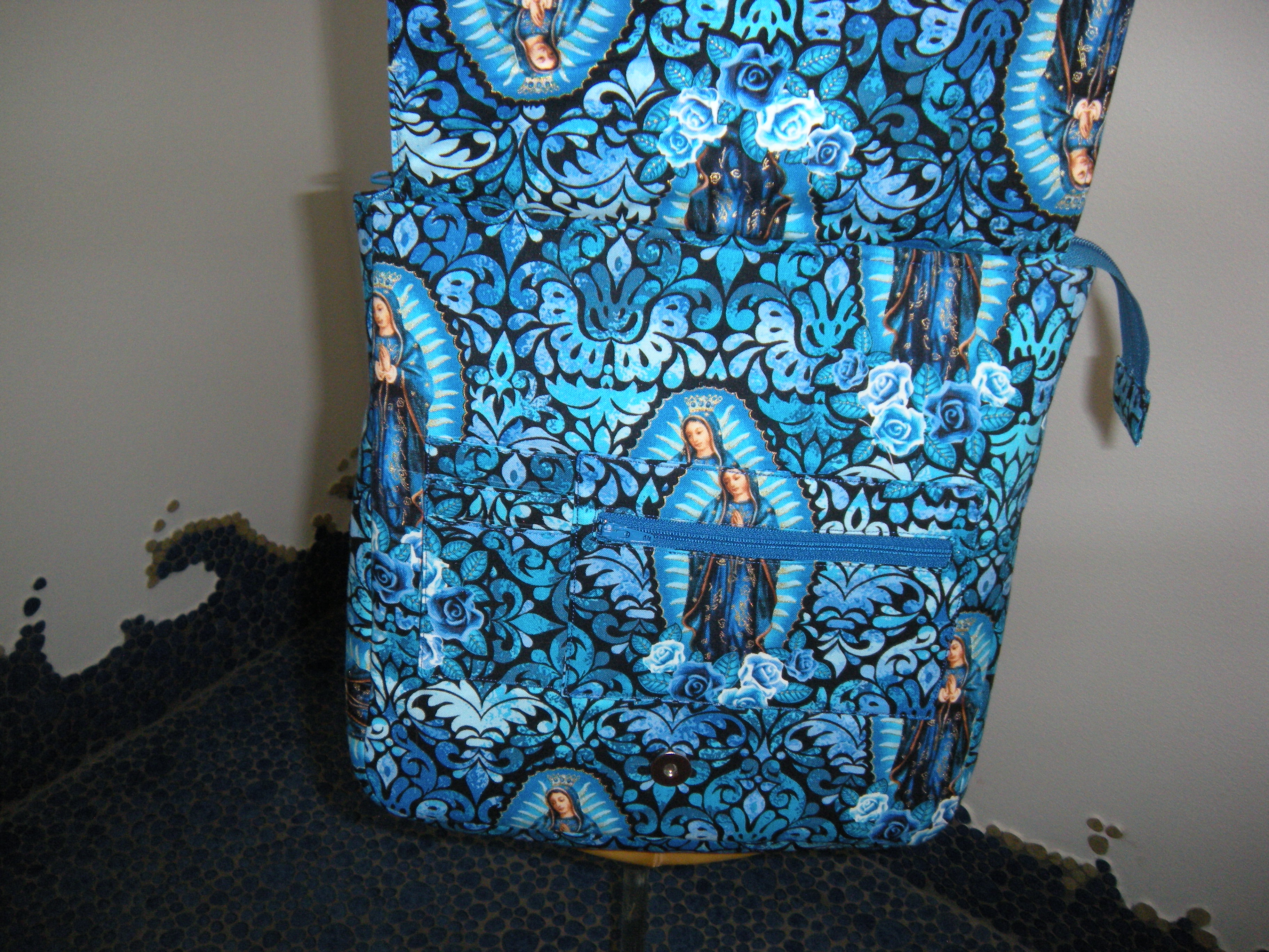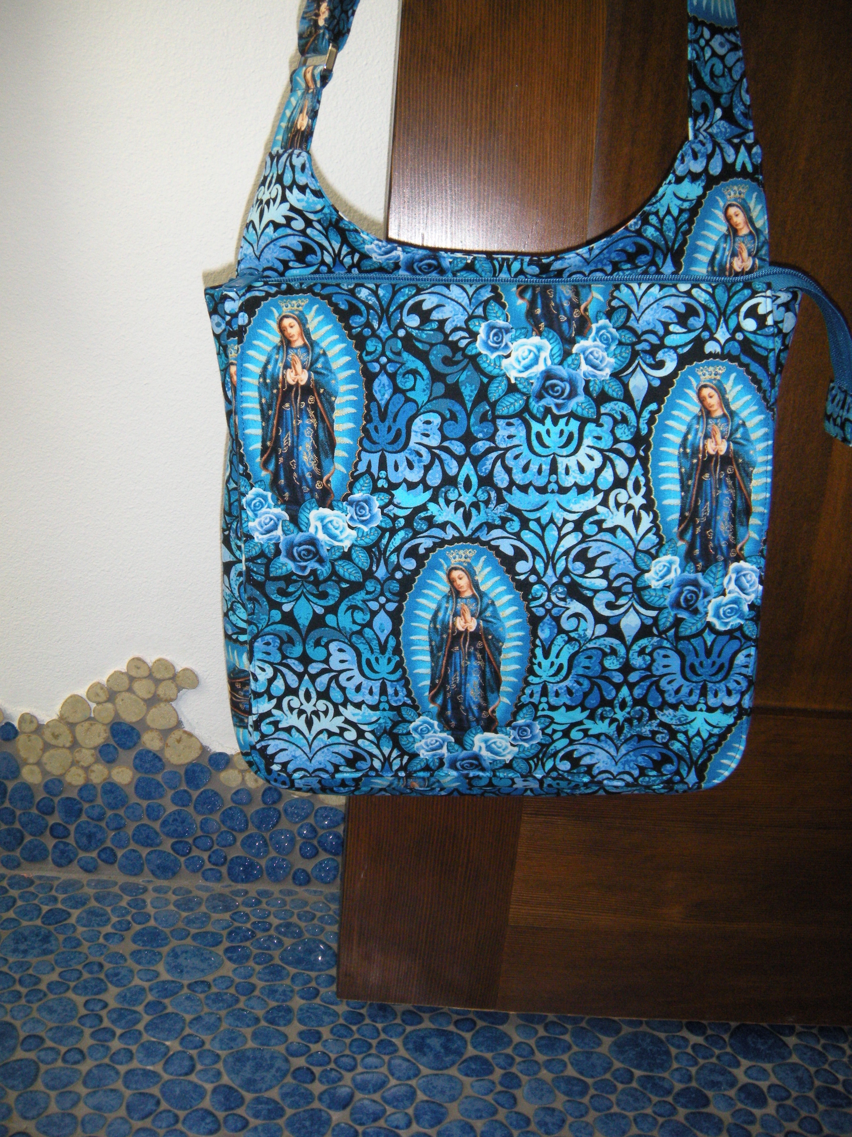 Our lady of Guada-LOO-pe. It’s the February bag-of-the-month, the Hyacinth Bag, from Sew Sweetness. I bought this fabric knowing I would find a perfect project for it. I can always do blue.