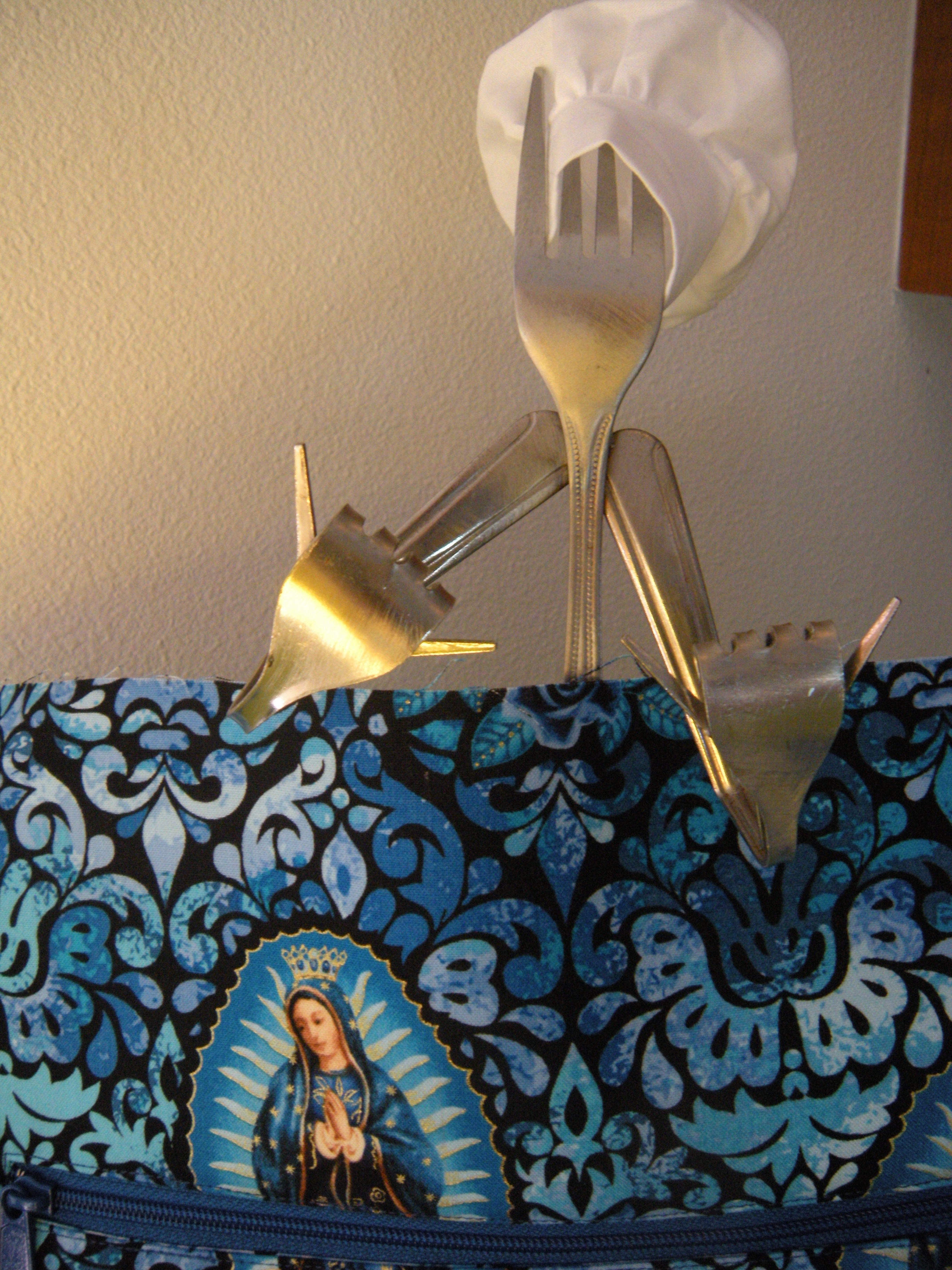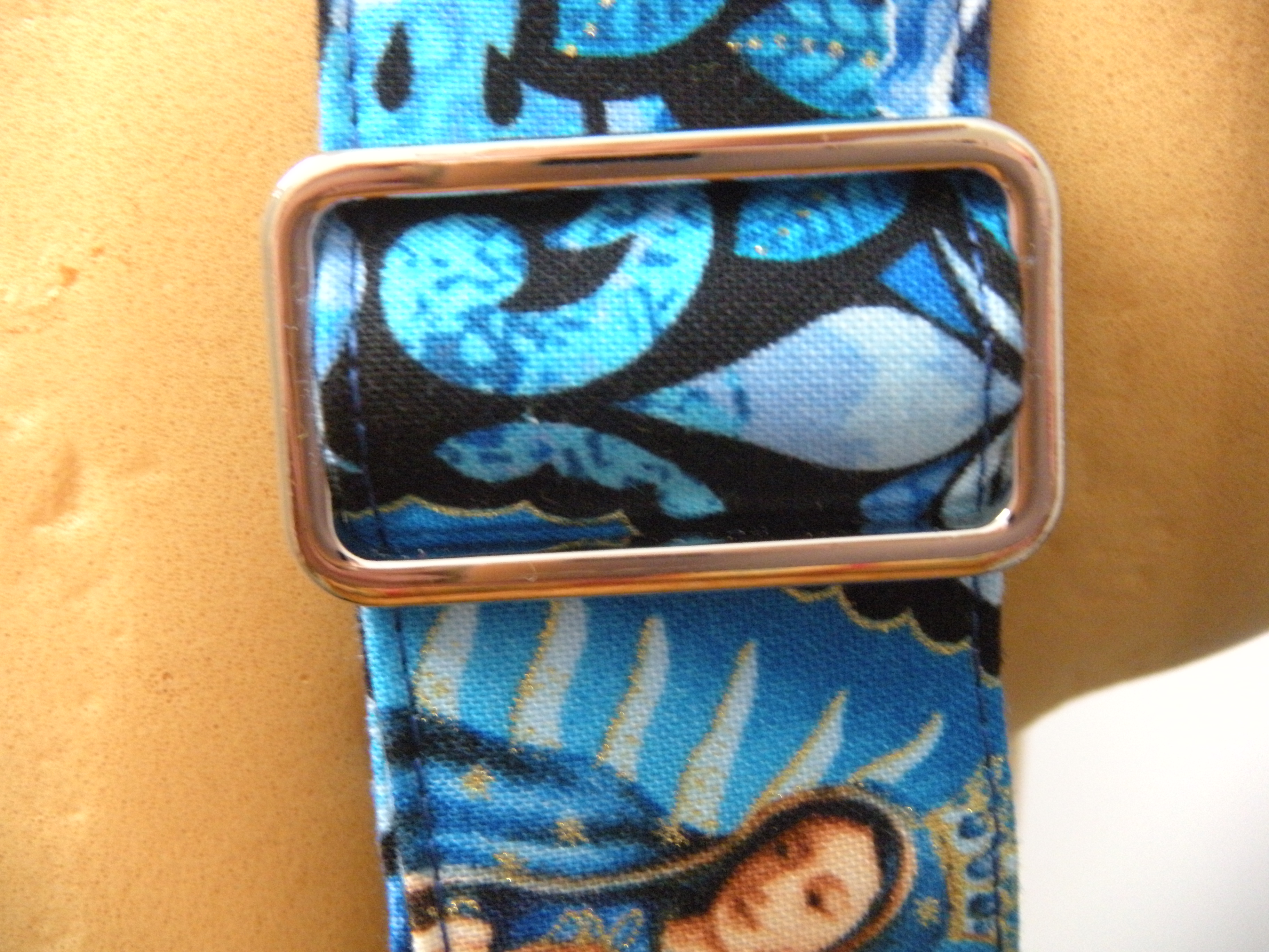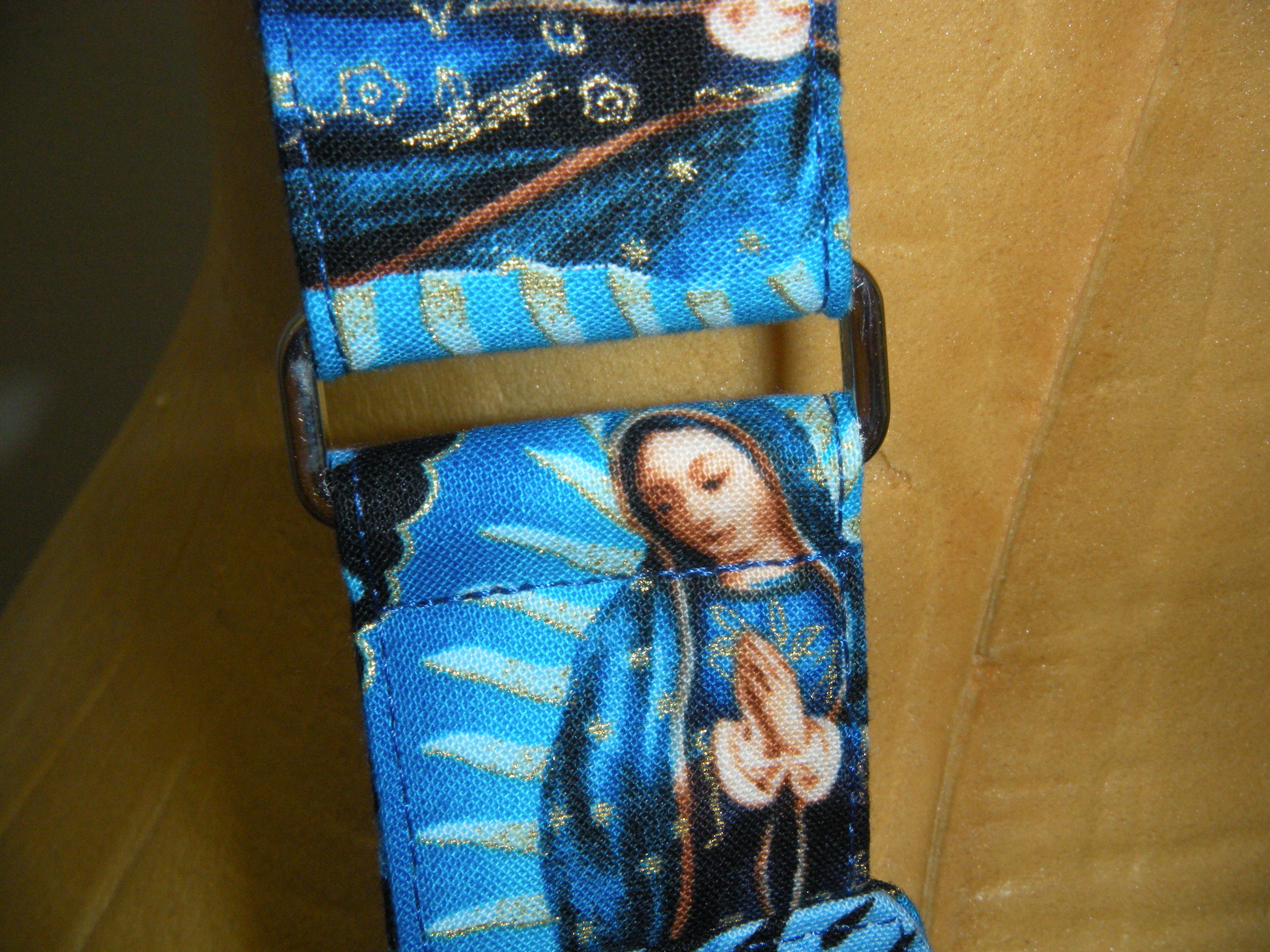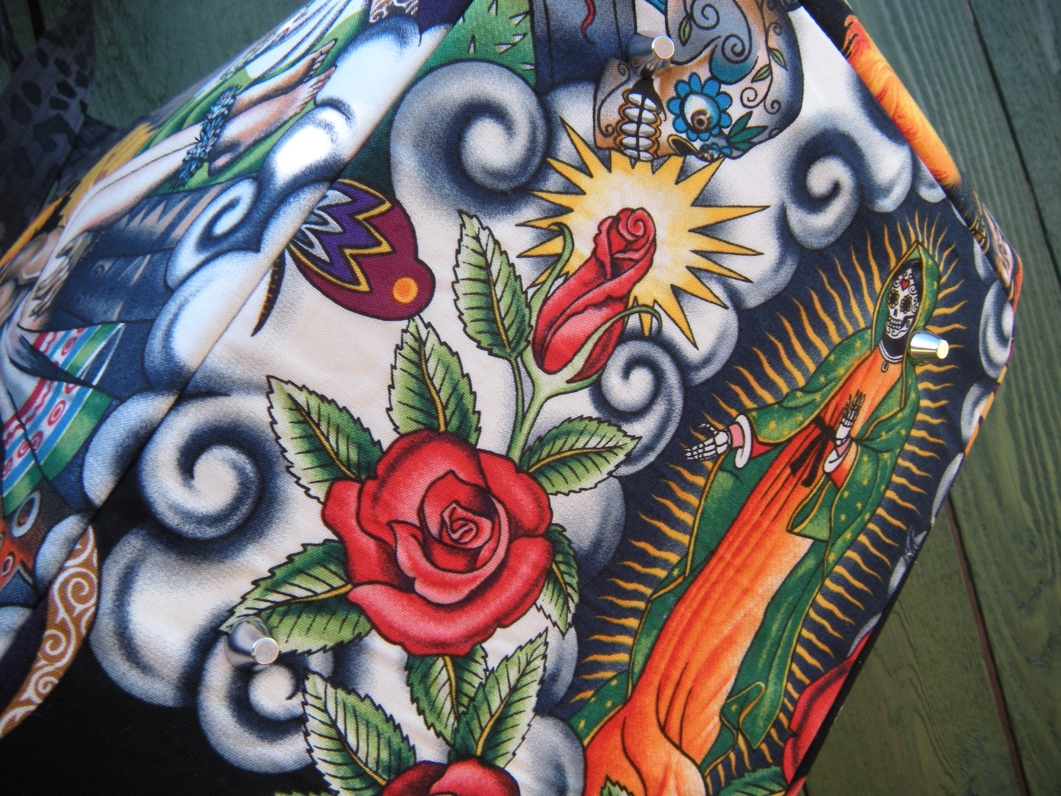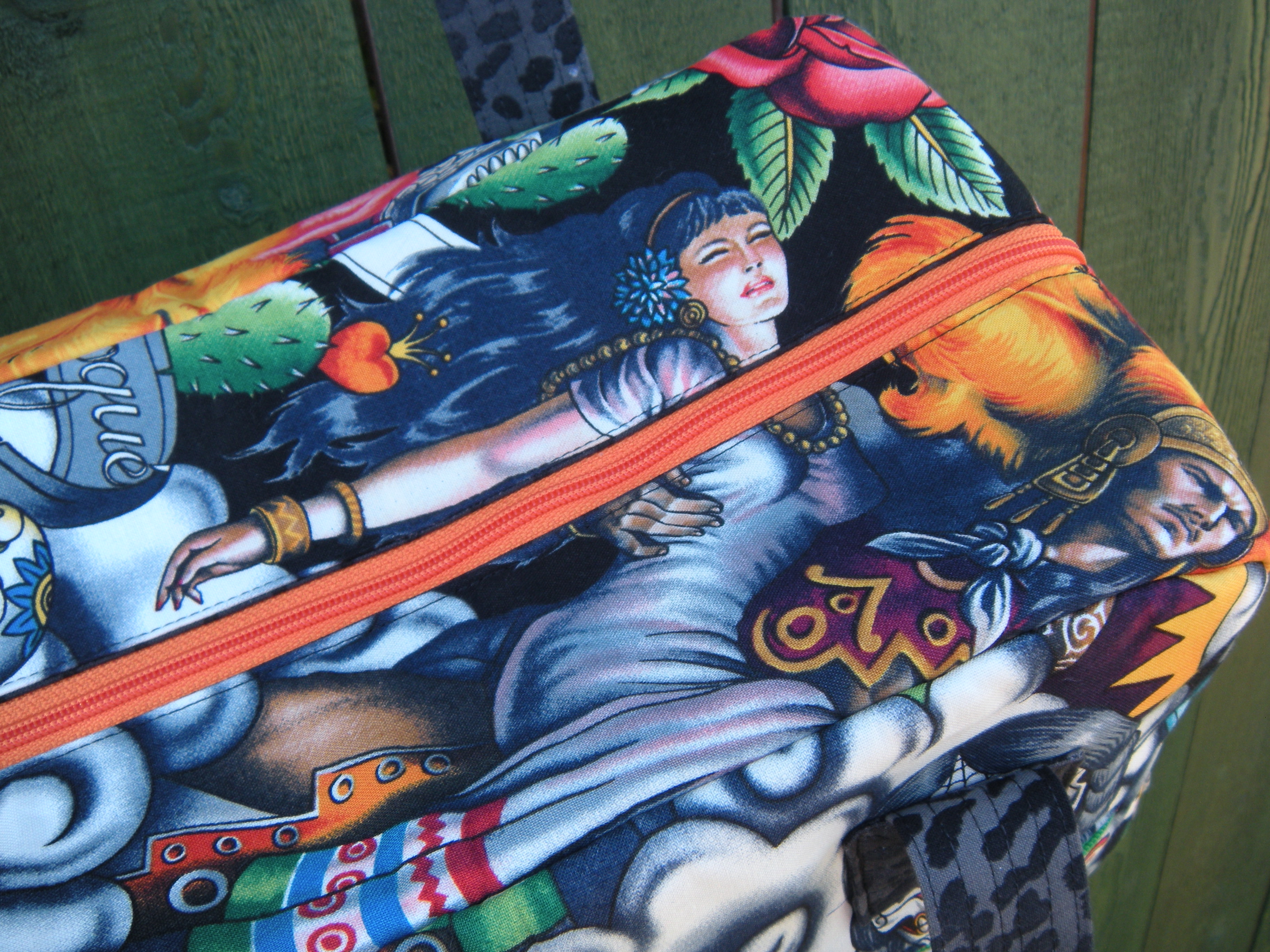 Our lady of Guada-LOO-pe. It’s the February bag-of-the-month, the Hyacinth Bag, from Sew Sweetness. I bought this fabric knowing I would find a perfect project for it. I can always do blue.