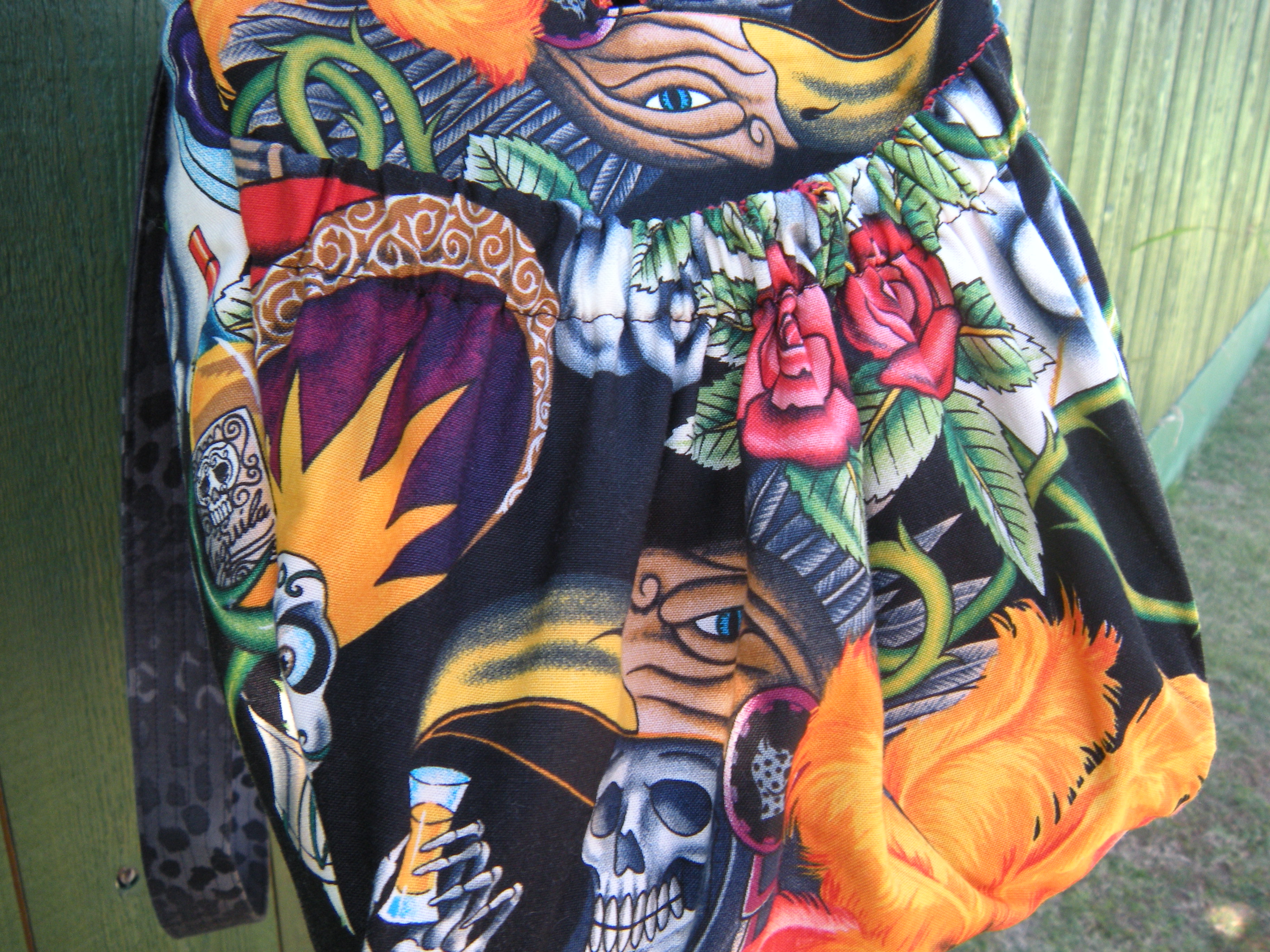 This is the back side of the bag. That one lady is doing pretty good, considering the fact that she has been bisected by a blue zipper.