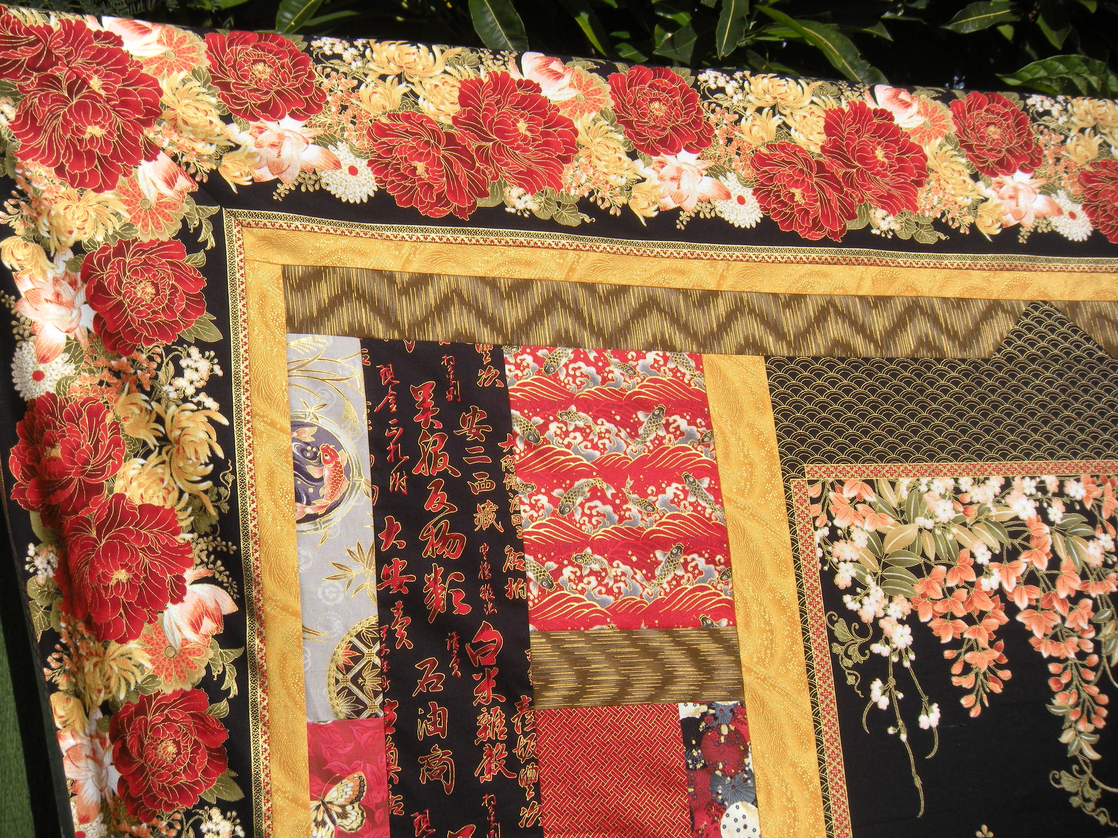 It was fun picking out bits and bobs of fabric for the patchwork sleeves.  I added some pieces from my fabric collection, also.  I can’t imagine making this quilt without throwing in some koi!