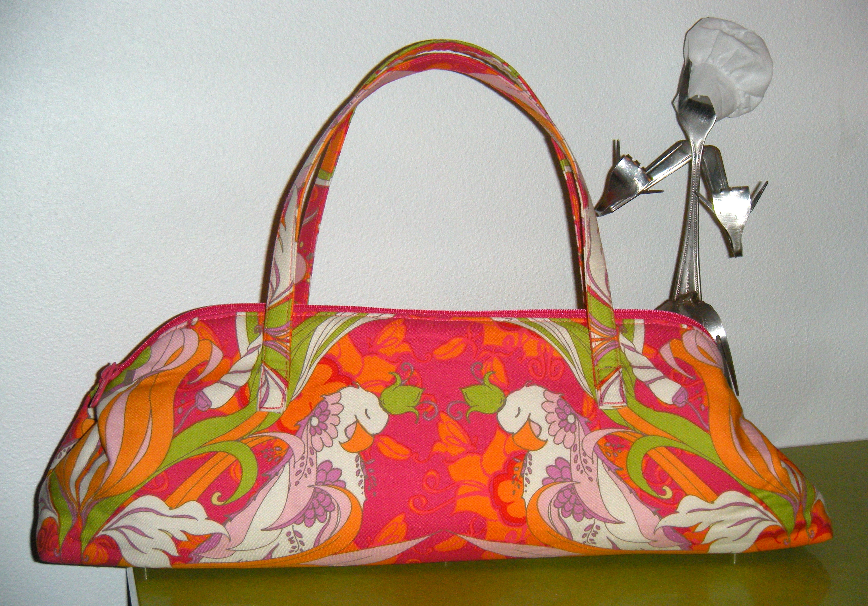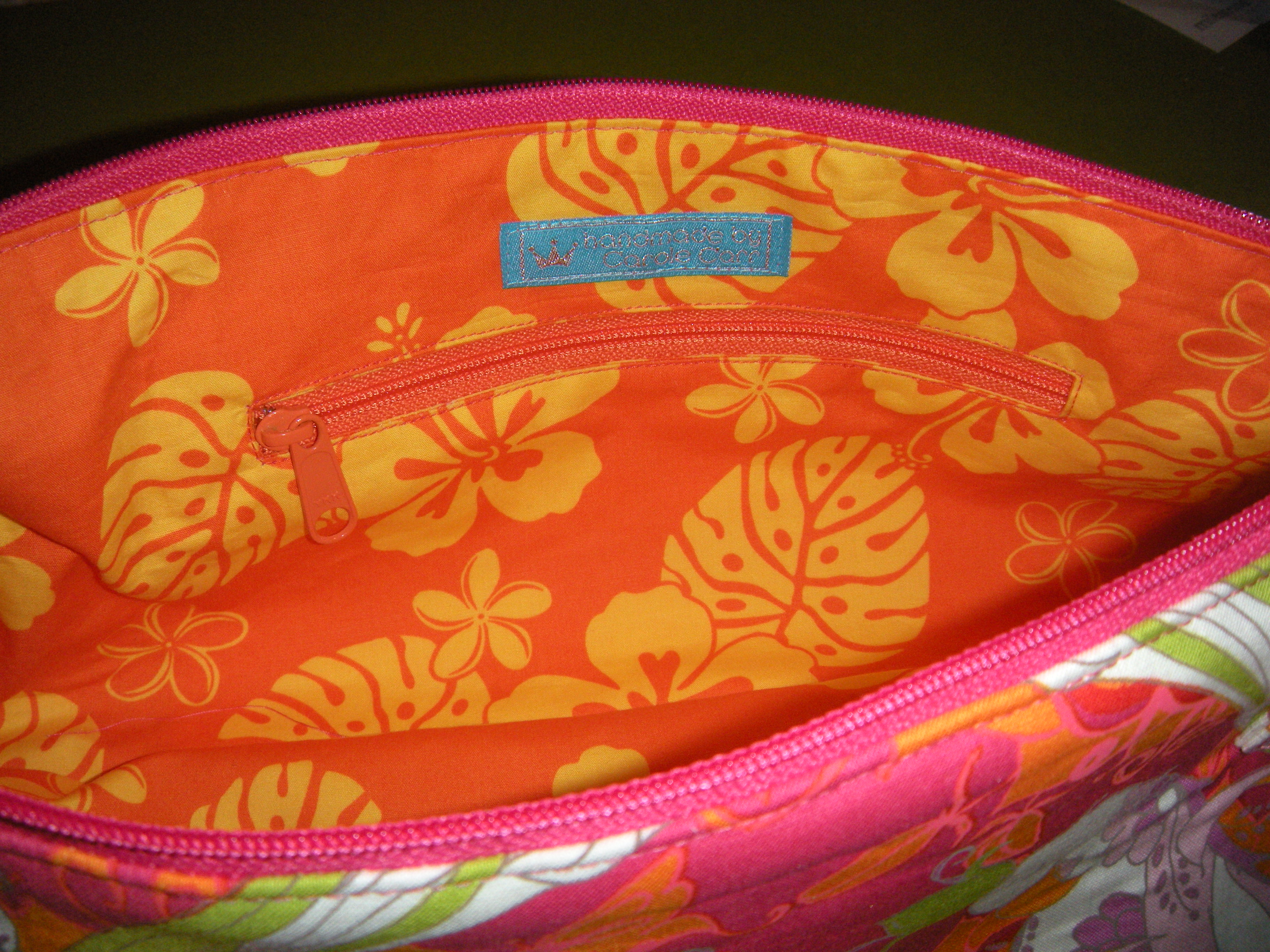 I think all my bags should pose with the Shaka Fork Chef guy. He really does show them off to their best advantage. Did you notice that I put five feet on the bottom? I had some logic working at the time, I have no idea now what it was! But doesn’t it just make you happy, with the happy colors, pink and orange zippers, five feet and all? I added pockets on the inside so I have a fighting chance of finding my phone and my lipstick. Plus, it just seems wrong to make a bag and not have at least two zippers in it! I love putting in zippers, and I don’t care who knows it.