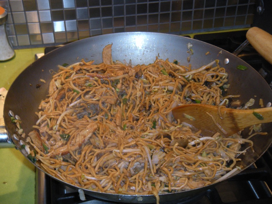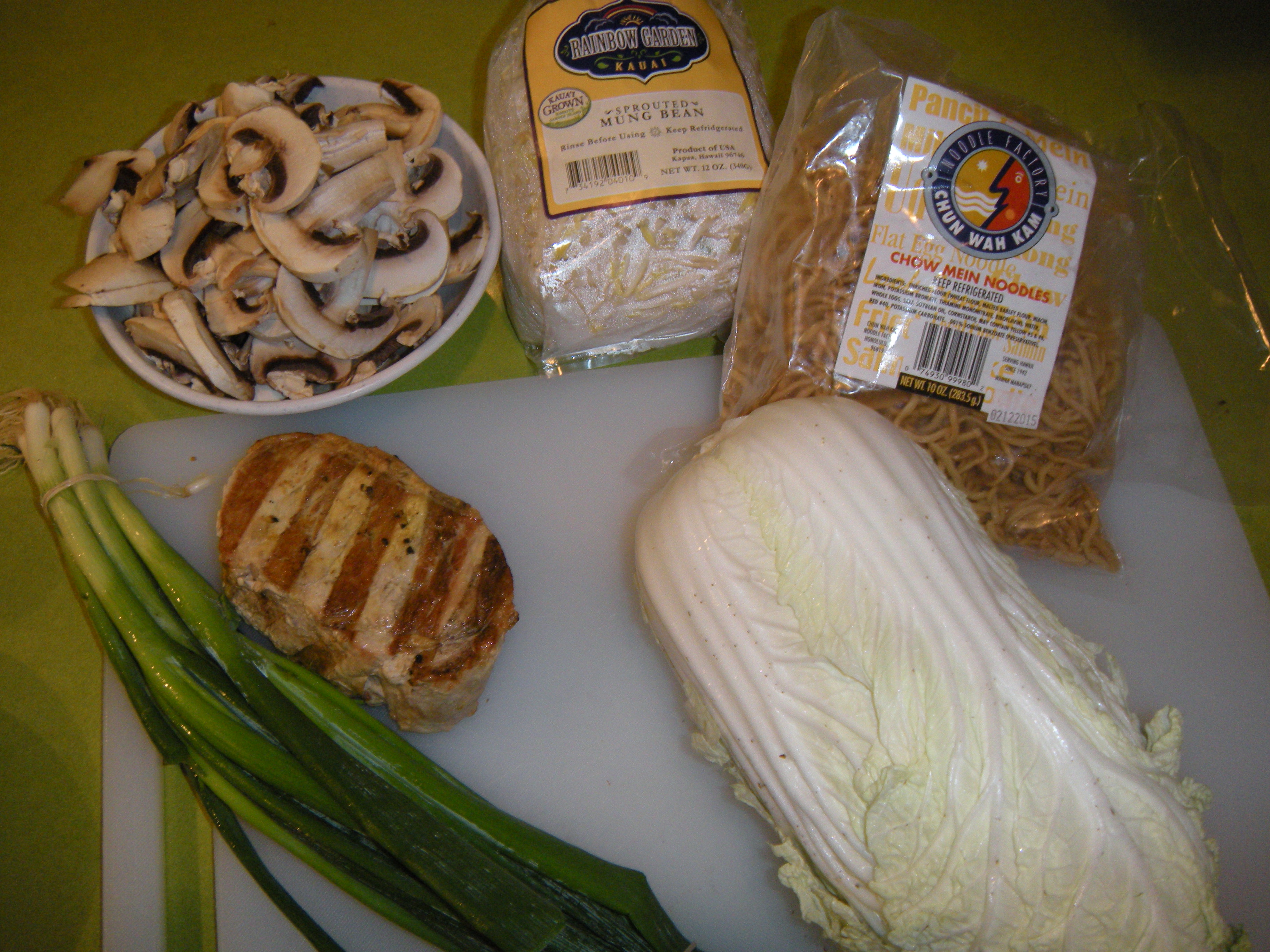 Using the admittedly scarce resources at our local market, I scrounged up the fixins for stir-fry. Mushrooms, napa cabbage, bean sprouts, green onions, and one of those pork chops. Oh yeah, and noodles. For the sauce, I used a combo of soy sauce and Szechuan stir-fry sauce.