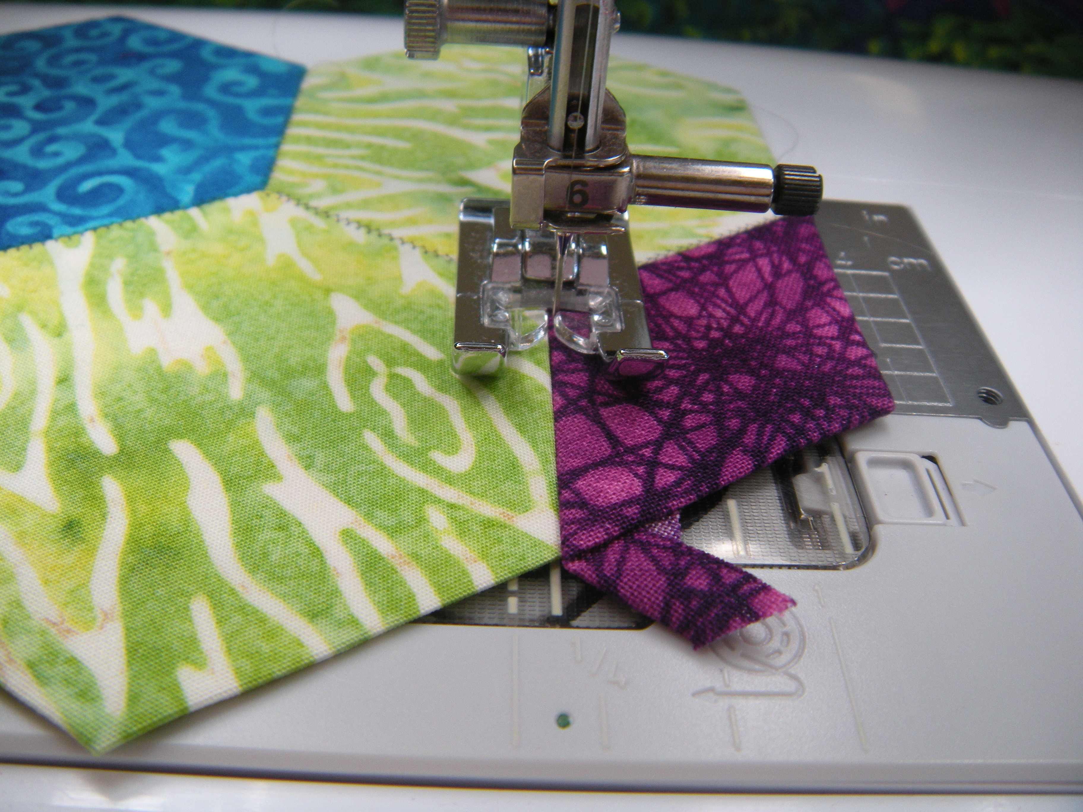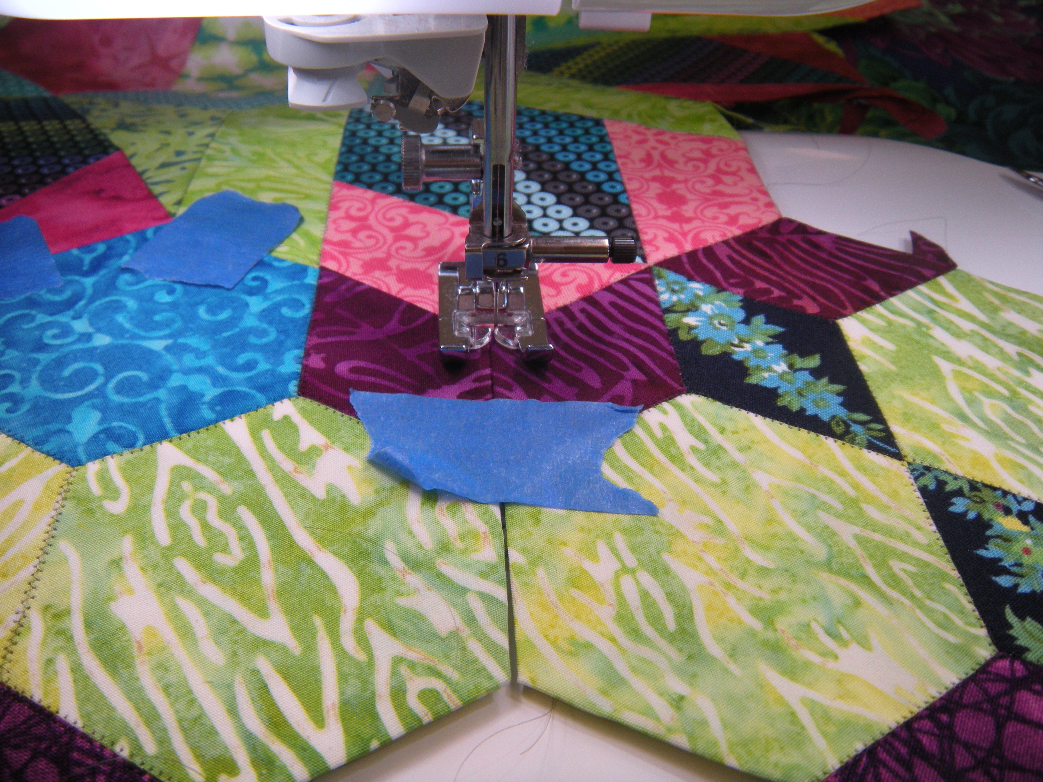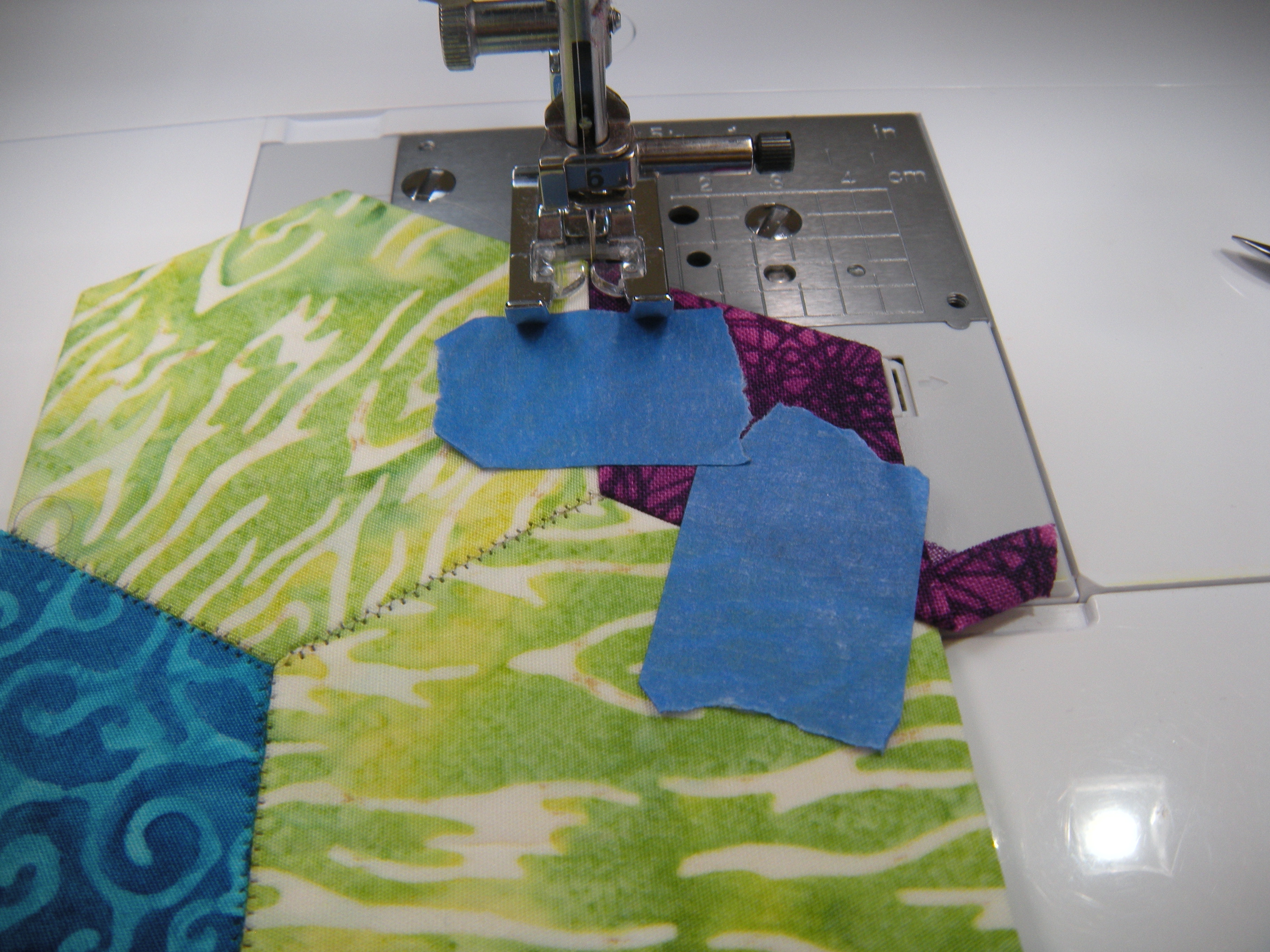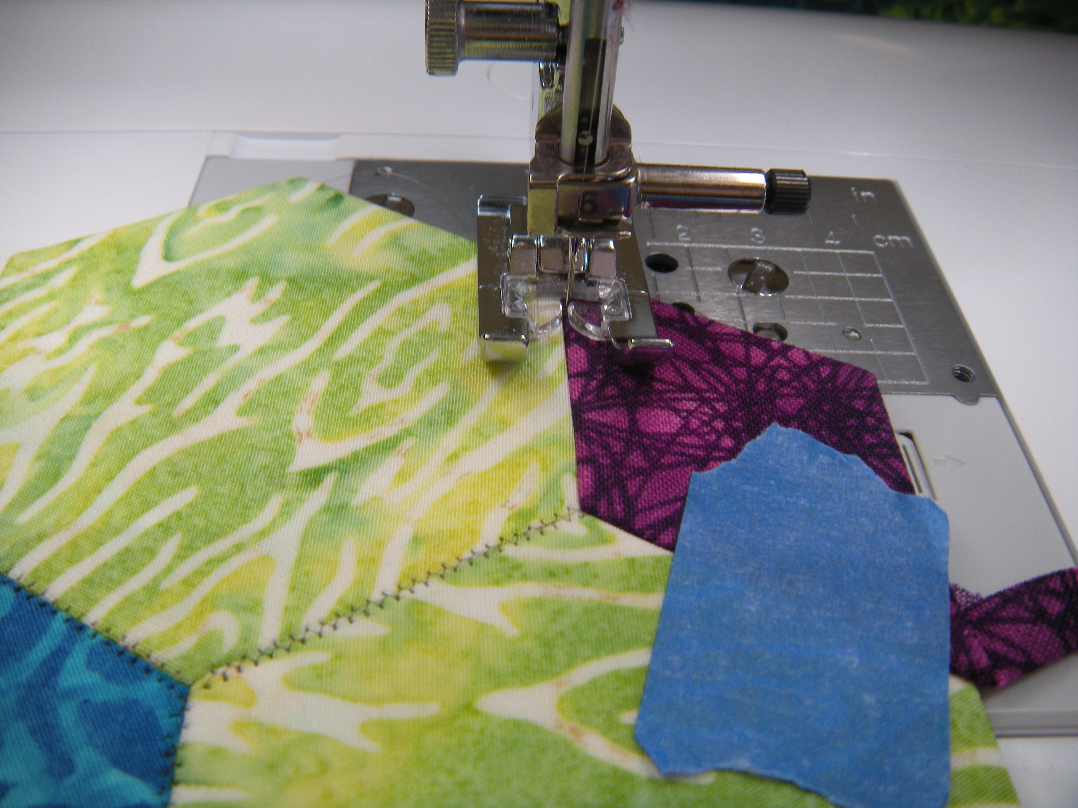 You’ll notice that the tape behind the presser foot in the last photo above remains in place. Keep it there so the blue hexie does not wiggle away from it’s position.