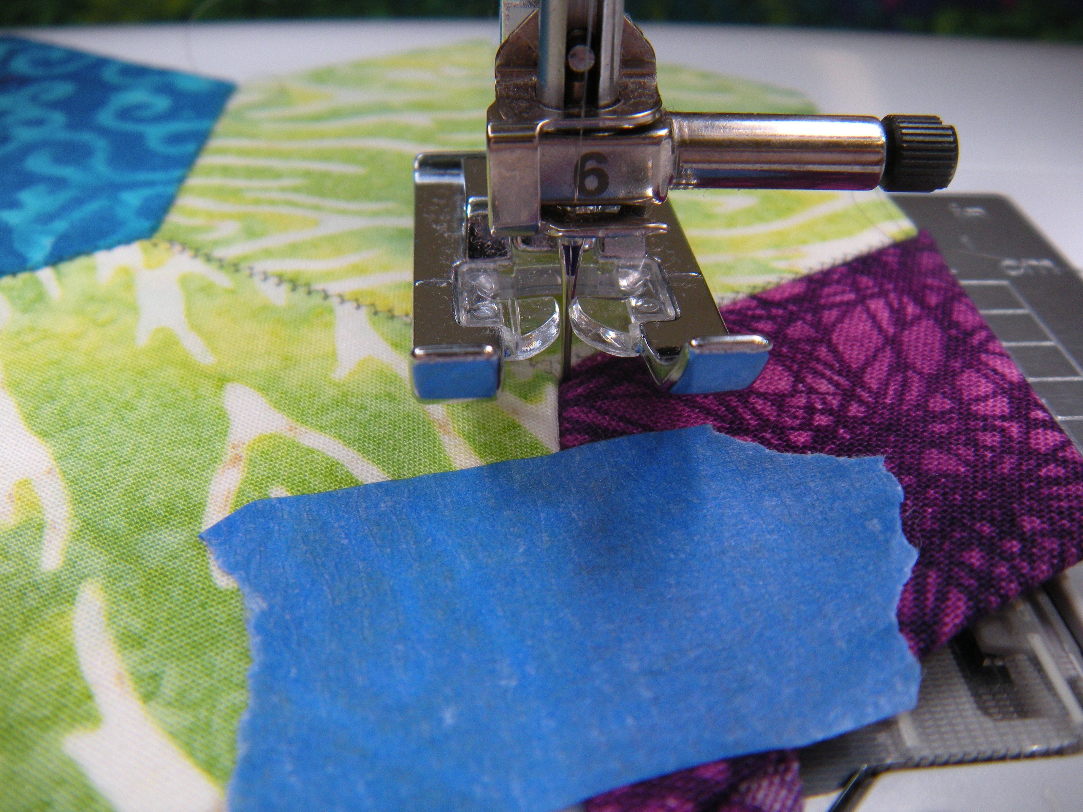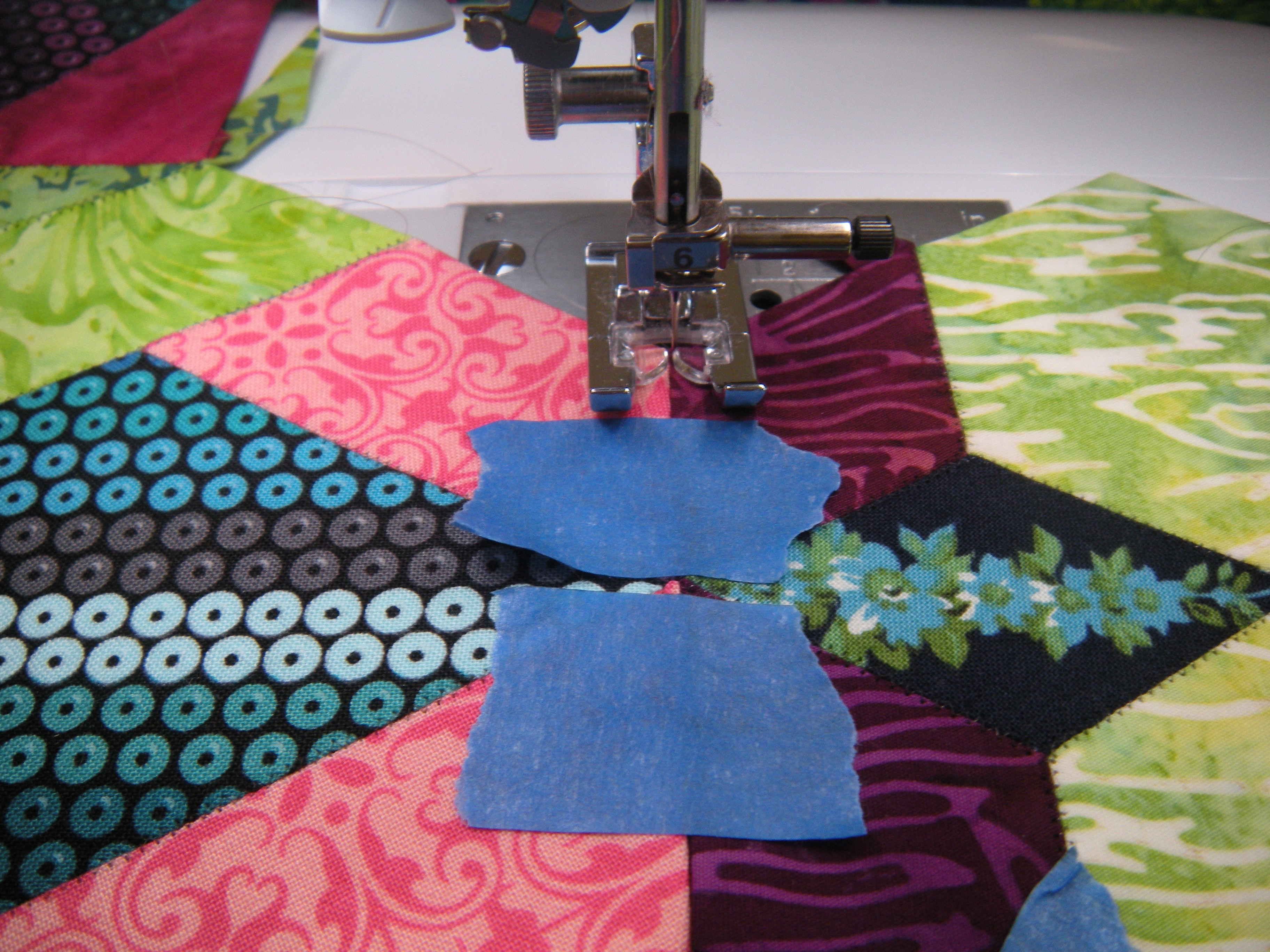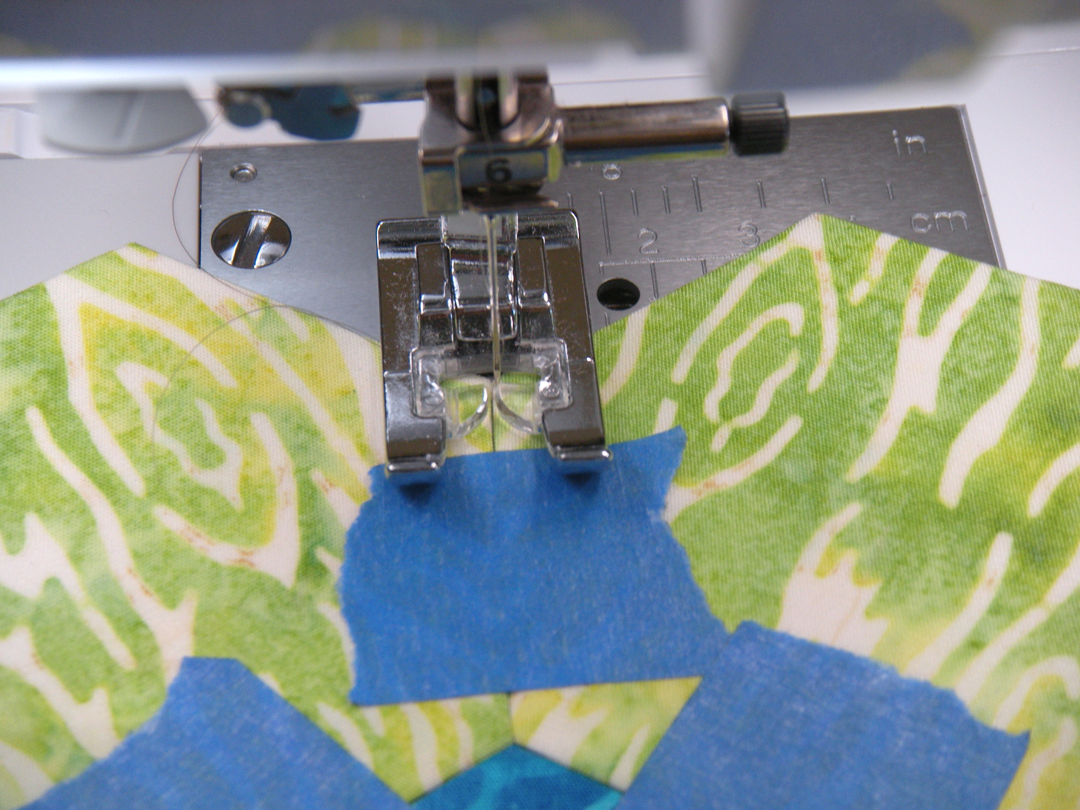 You’ll notice that the tape behind the presser foot in the last photo above remains in place. Keep it there so the blue hexie does not wiggle away from it’s position.