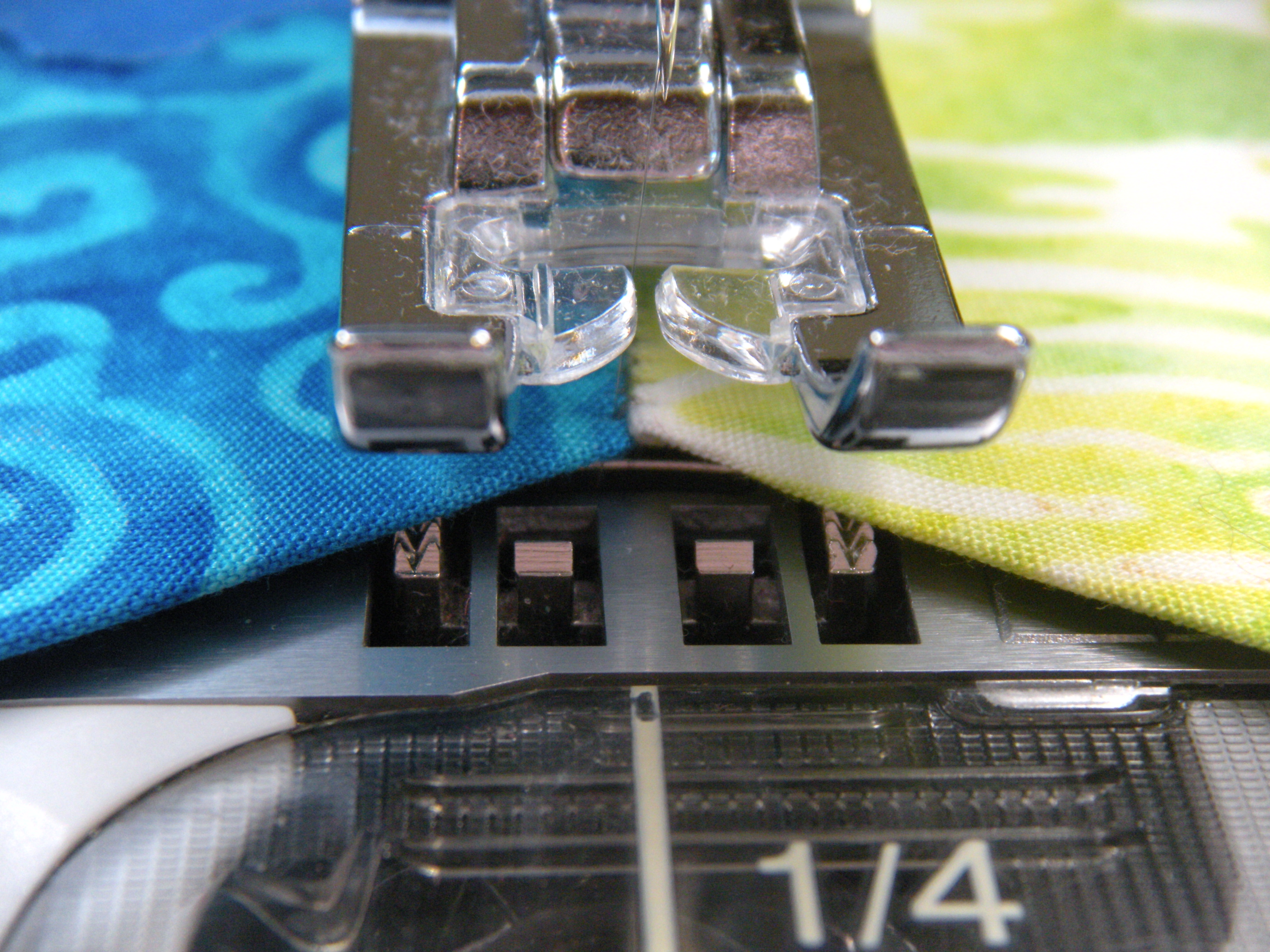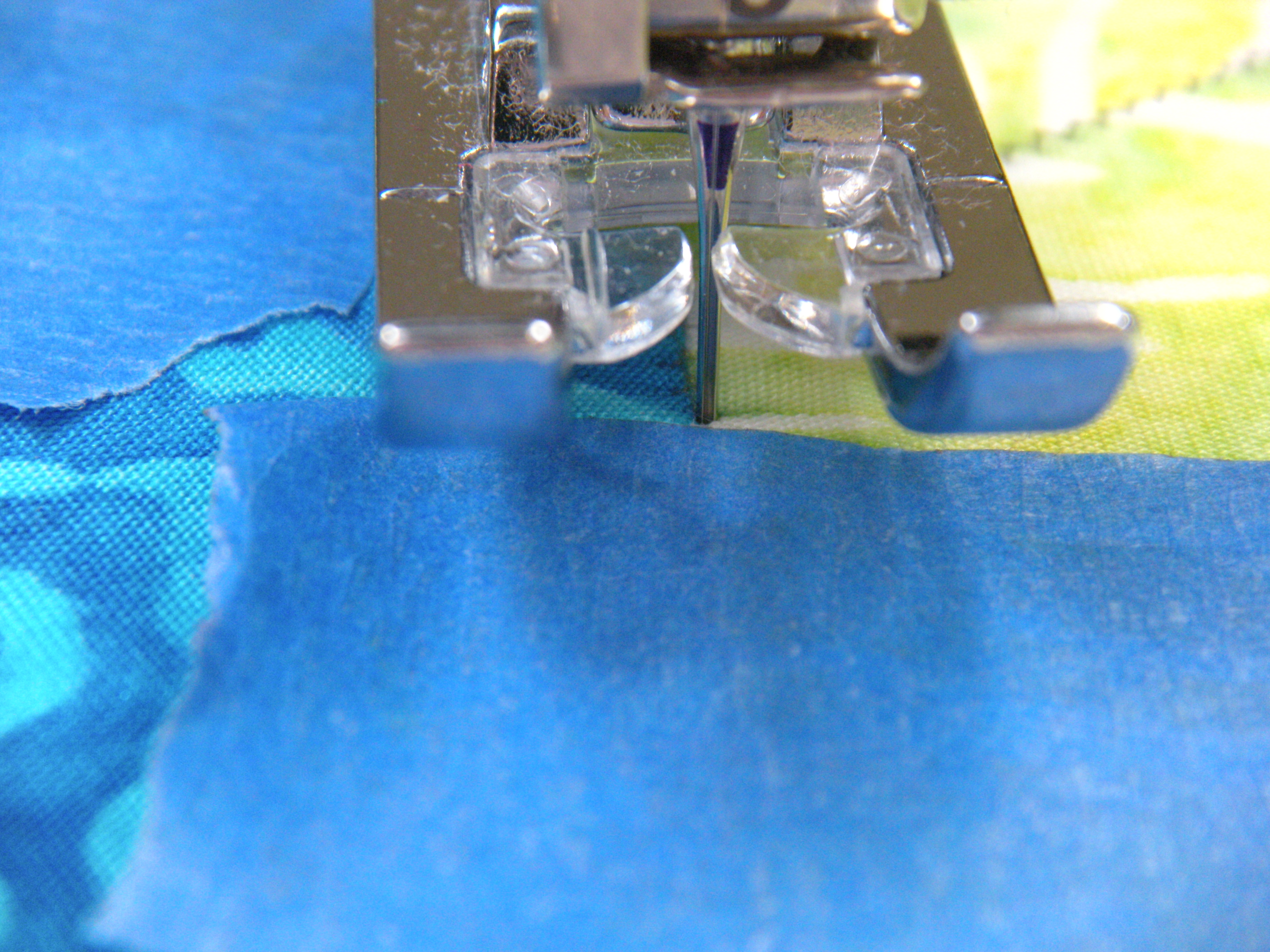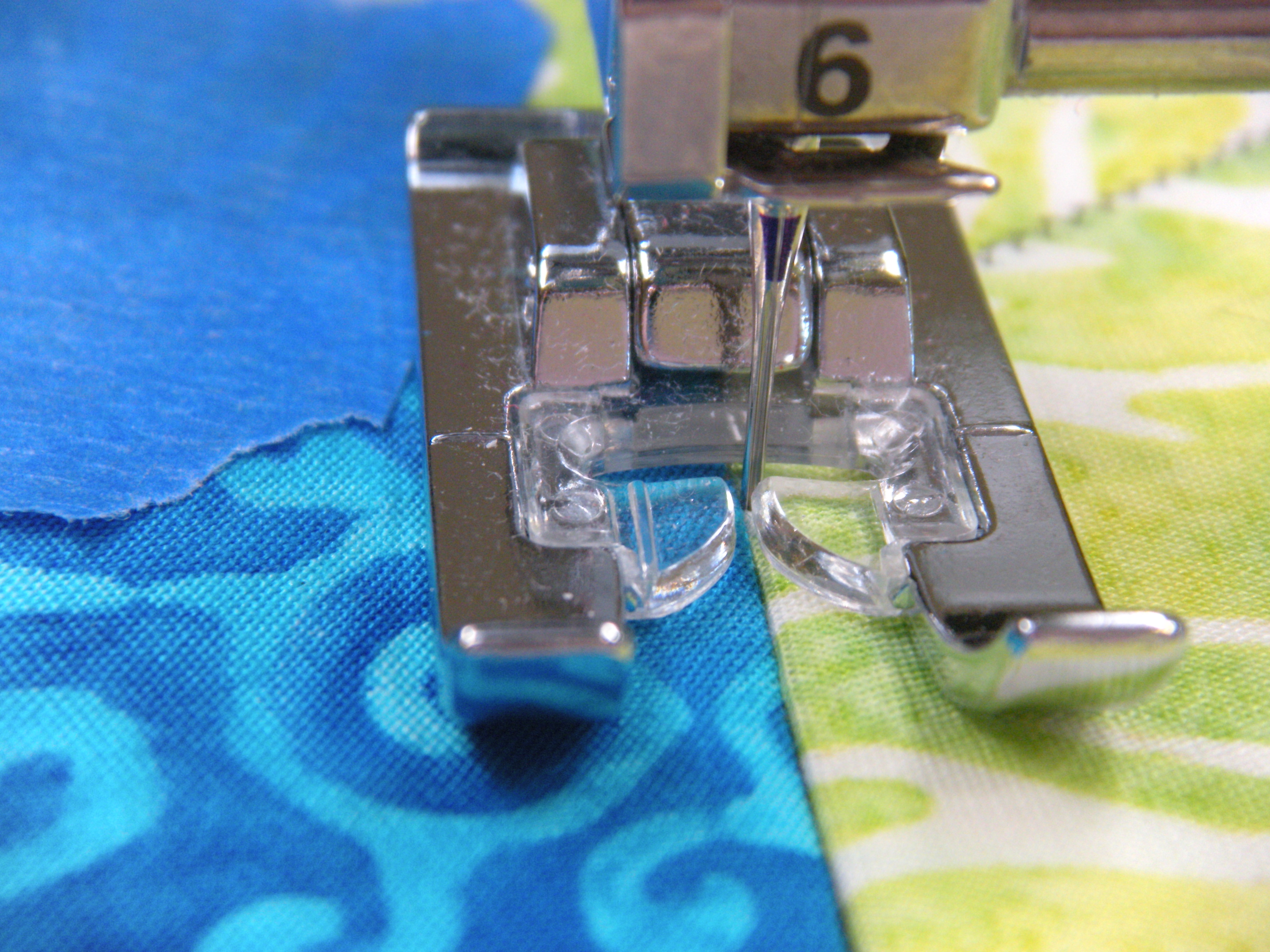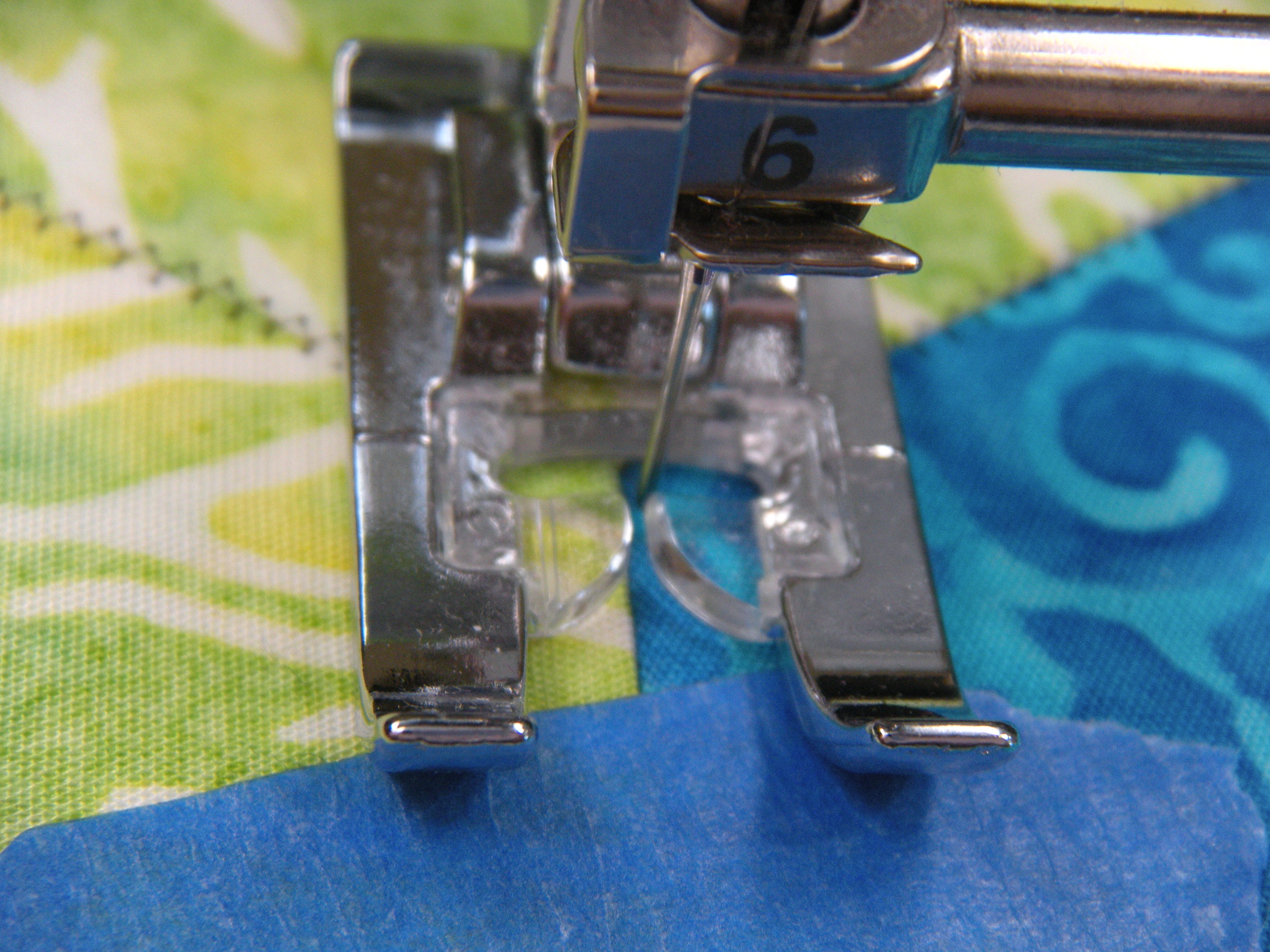 You’ll notice that the tape behind the presser foot in the last photo above remains in place. Keep it there so the blue hexie does not wiggle away from it’s position.