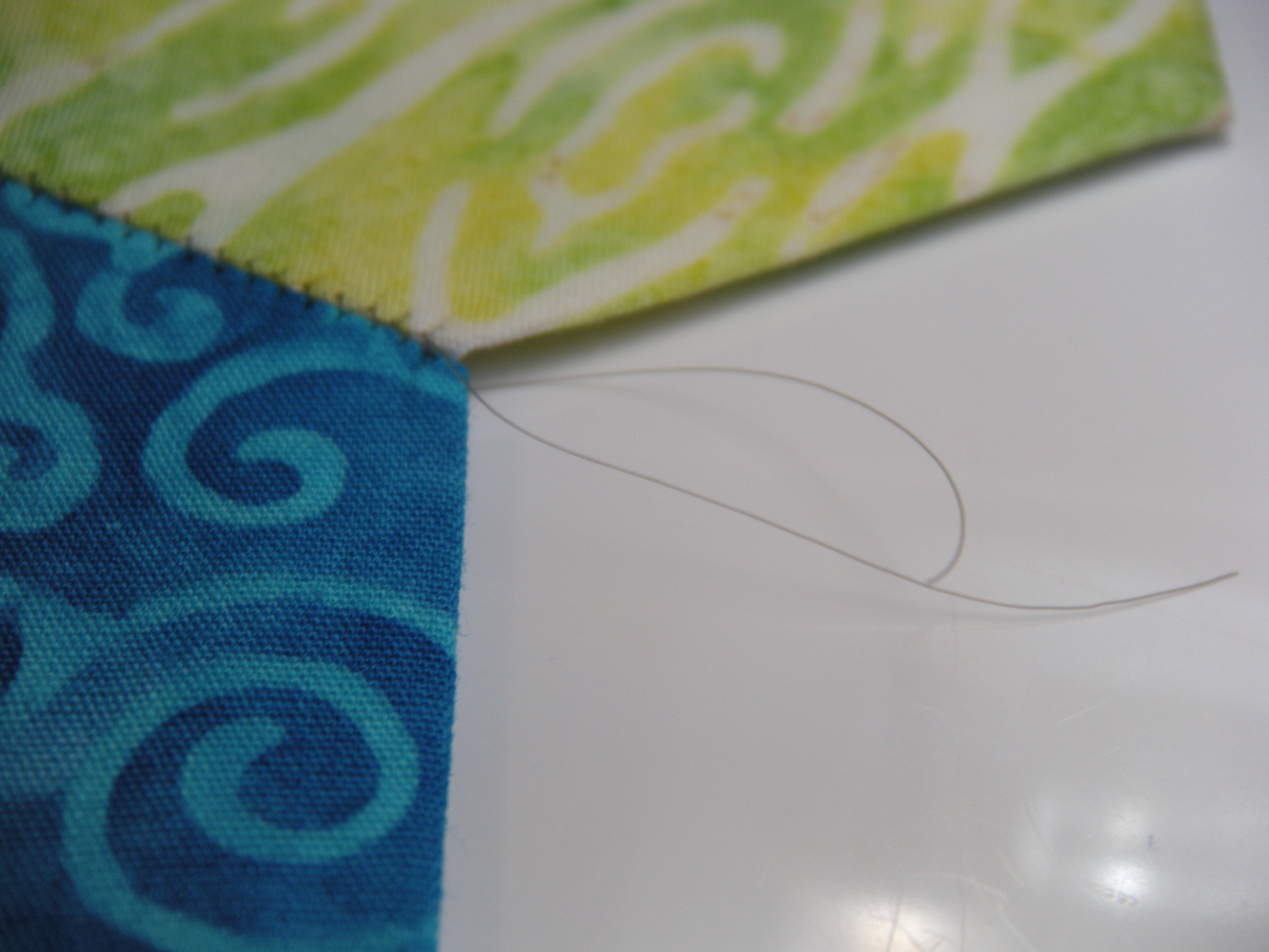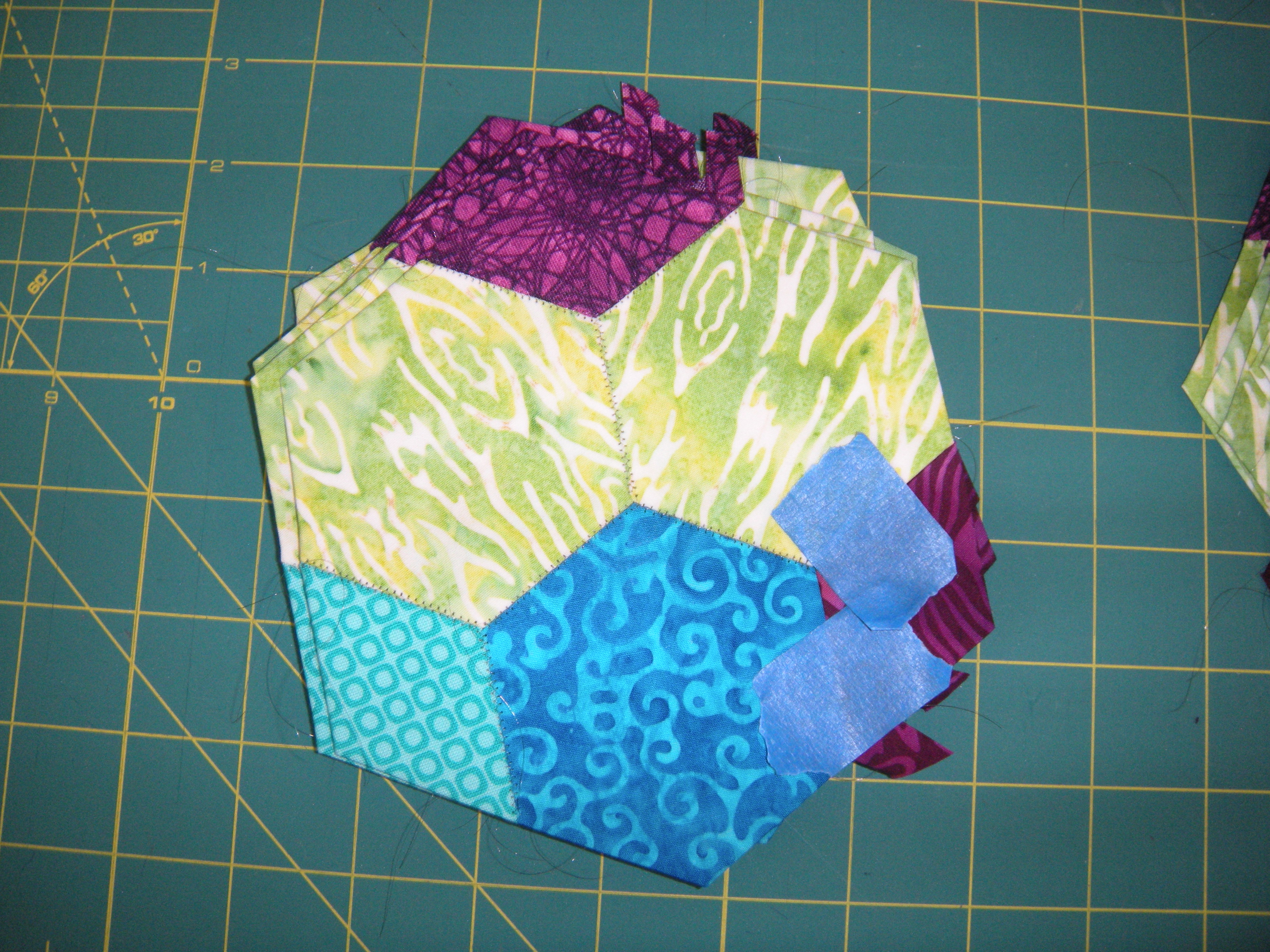 Look at those hairy little threads just dangling. Now we’re going to do the seam joining this blue hexie to the other green/yellow hexie.