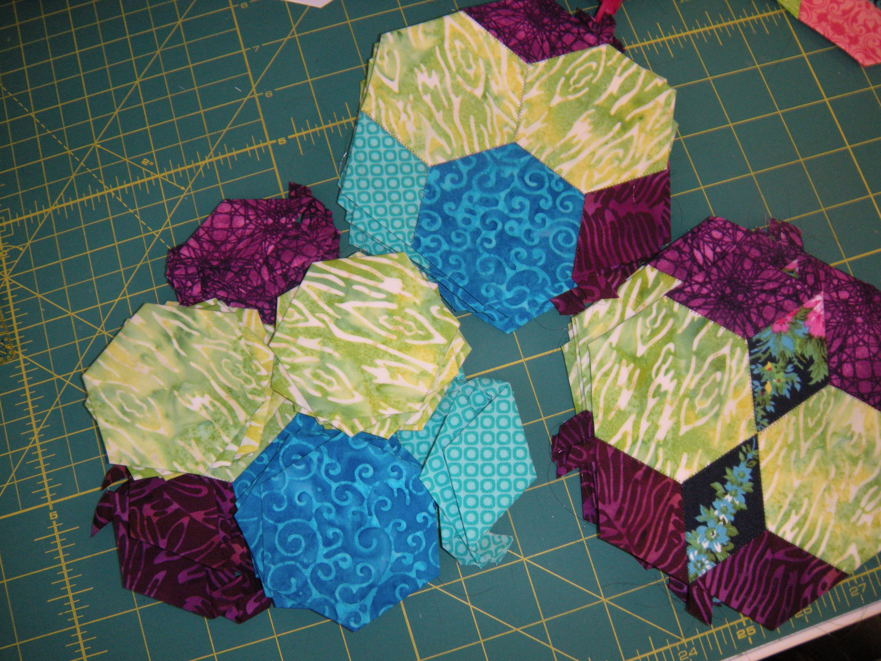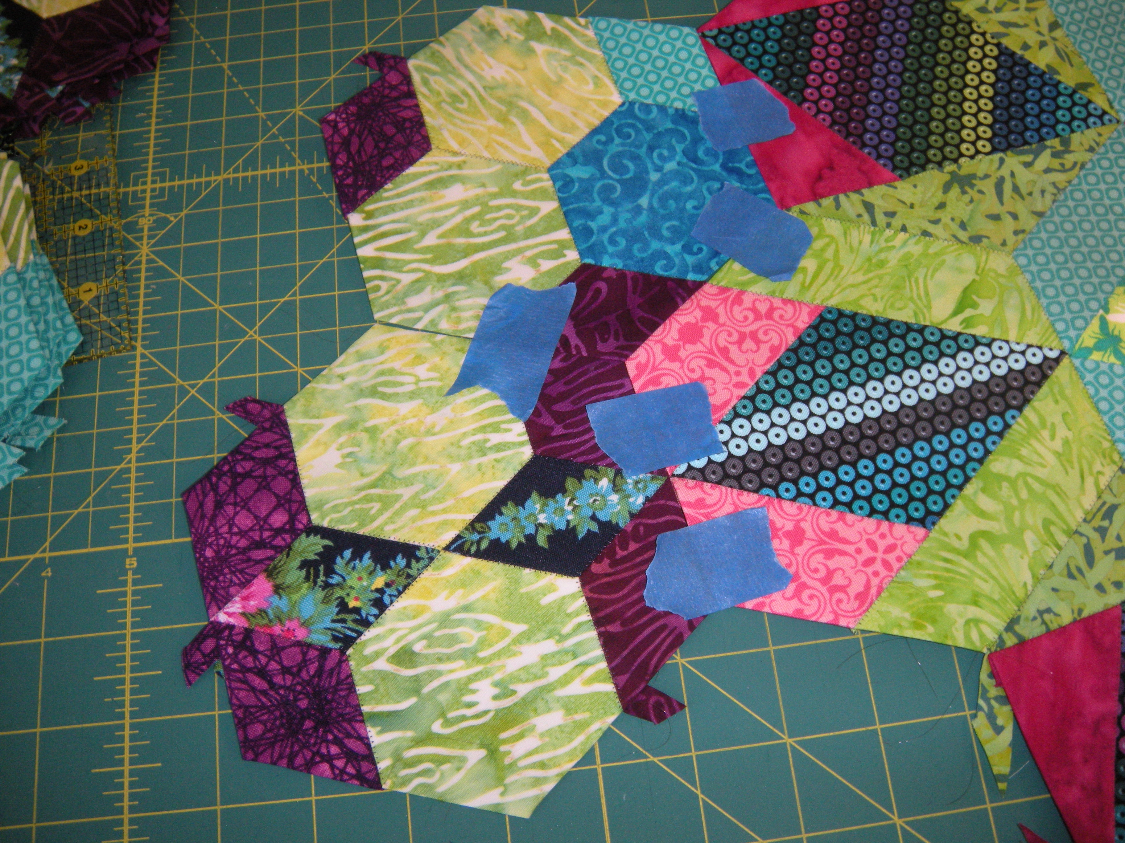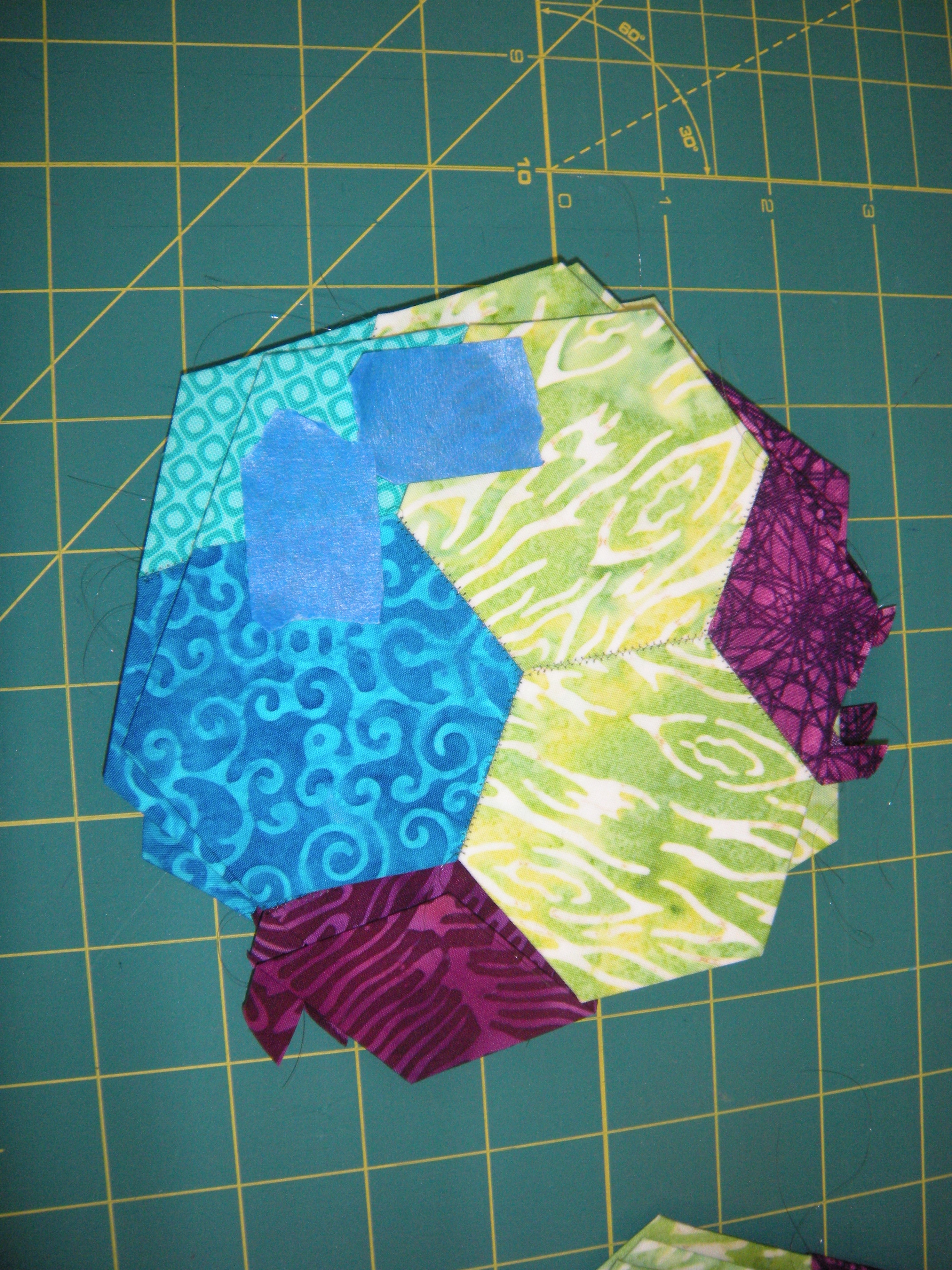 This is block one from the outer row of rosette one. Six pieces in the hexagon, I decided that the best way to start was to join the three hexies in the center together first. I used my painter’s tape to hold the three together.